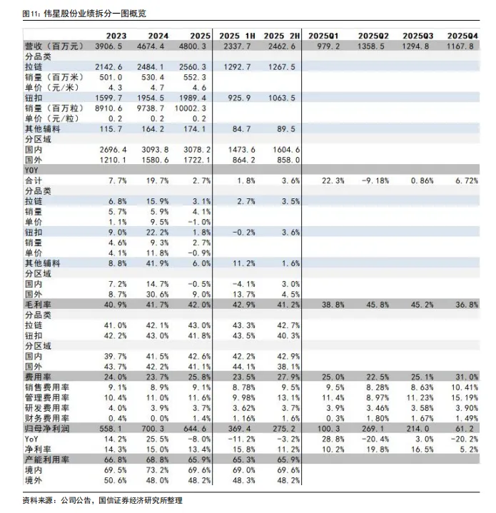 国际市场收入快速增长,拉链业务表现优于钮扣。1)分品类:拉链/钮扣收入分别同比+3.07%/+1.79%至25.60/19.89亿元;拉链业务毛利率同比提升0.87个百分点至42.99%,而钮扣业务毛利率同比下降1.20个百分点至41.76%。2)分区域:国内市场收入同比-0.51%至30.78亿元。国际市场在海外生产基地优势的发挥下,实现逆势增长,收入同比+8.95%至17.22亿元,收入占比提升至35.88%。3)产能:产能扩张稳步推进,但利用率有所下滑。2025年,钮扣总产能提升至126亿粒(2024年为120亿粒),拉链总产能提升至10亿米(2024年为9.1亿米)。但受宏观环境影响,总产能利用率同比下降2.9个百分点至65.92%。越南生产基地尚处产能爬坡阶段,报告期亏损2,973.97万元,但经营性亏损在持续收窄,预计2026年下半年有望进入盈亏平衡状态。
