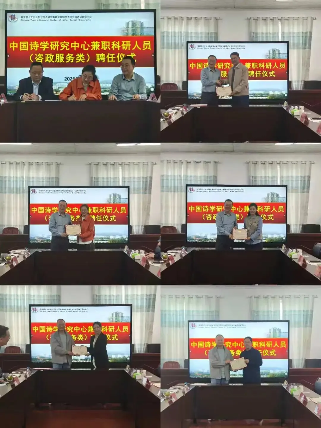 辅导会后,举行了中国诗学研究中心兼职研究人员(咨政报告类)聘任仪式,张军辉、张泉泉、徐丽娜、马原、夏亮、杨帆6位老师受聘为中国诗学研究中心兼职科研人员,胡传志、潘务正为受聘人员颁发了聘书。
