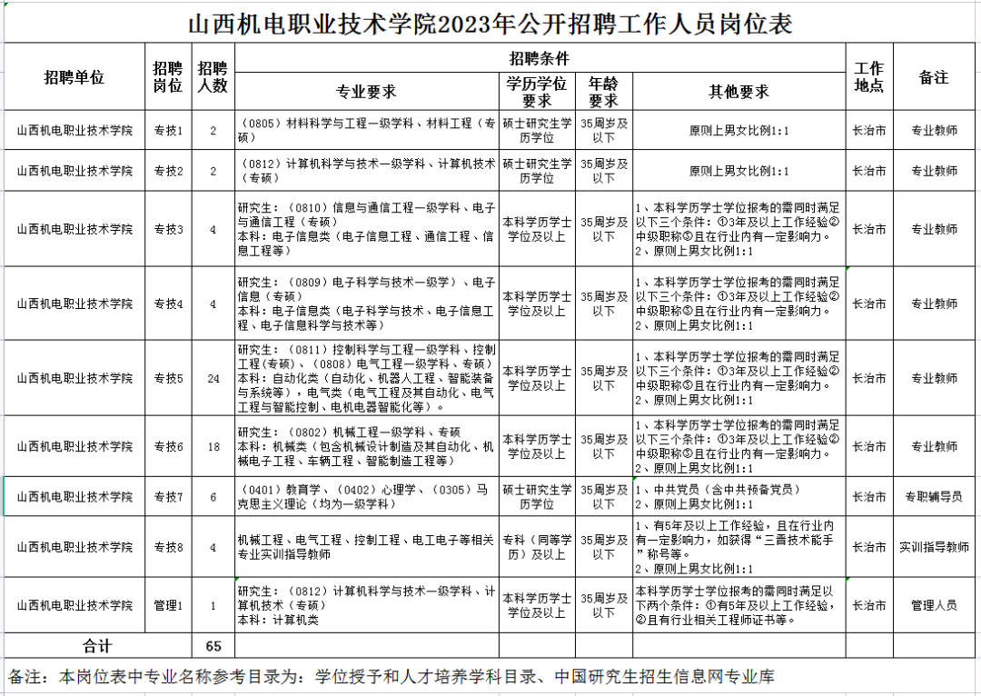 山西机电职业技术学院2023年公开招聘编外工作人员65名。
