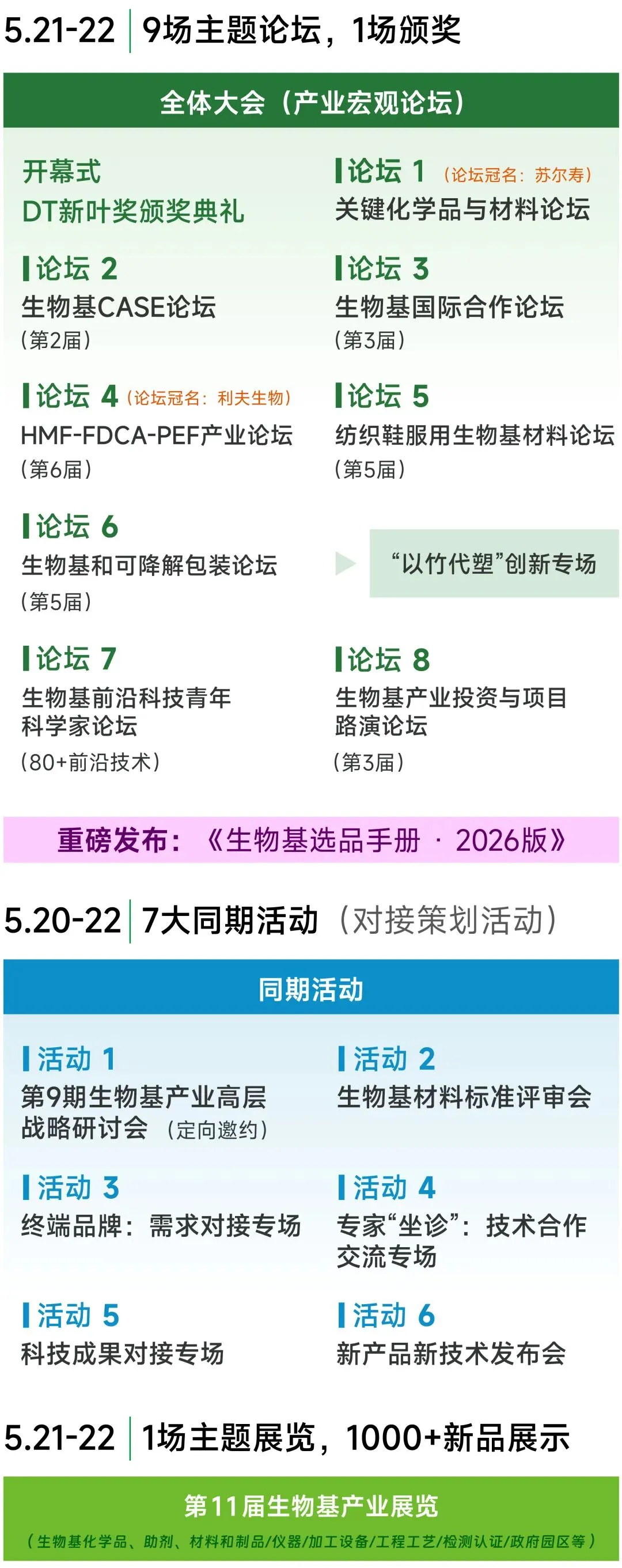 展会设置 “9大主题论坛 + 7大同期活动 + 1000个新品展示 + DT新叶奖评选与颁奖”,将汇聚1500+全球学者、行业领袖、创新先锋与用户品牌先锋,共同构建一个开放、协同、共生的产业生态圈。Bio-based 2026,不止于展会,更是全球生物基经济迈向成熟的关键一程。