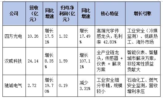 环境监测:增速最快(年增18.5%),碳排放监测、VOCs 治理、空气质量网格化监测带动红外、激光传感器需求爆发,四方光电环境监测业务成为重要增长极。