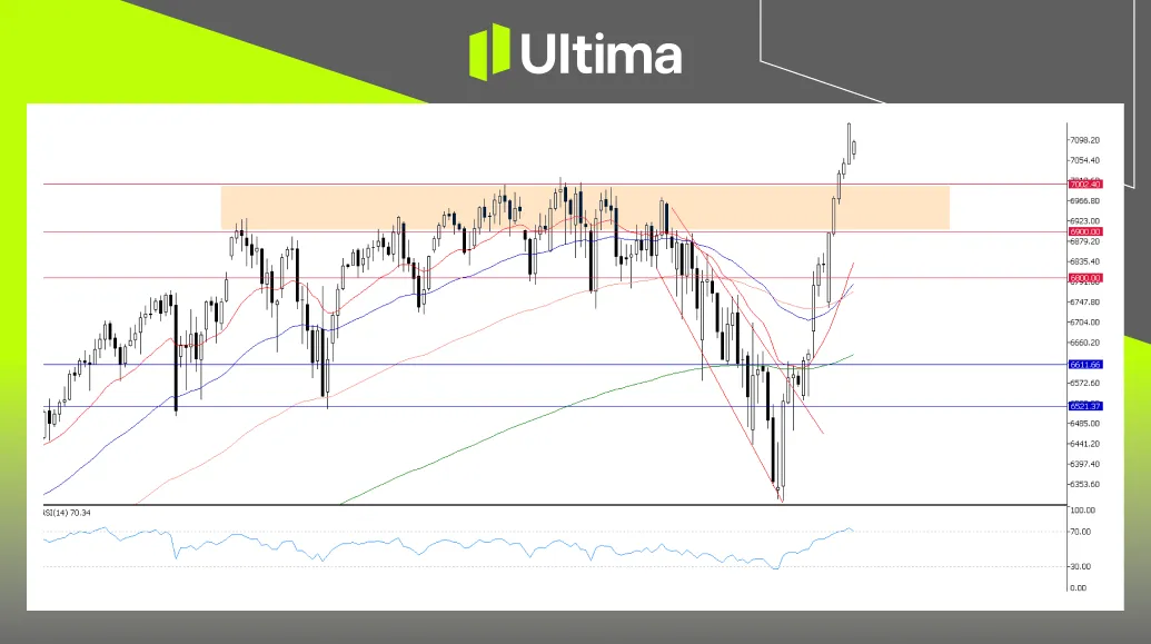 从技术面来看,标普500必须守住7000点这一心理关口,并将其转化为新的结构性支撑区域。只要价格维持在该水平之上,整体多头结构仍可延续。