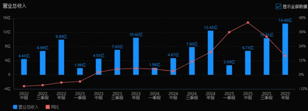 2025年营业总收入为 14.40亿元,相较于2024年的12.42亿元,增长了15.97%。评价: 公司营收保持稳健增长,虽较前三季度(32.21%)有所放缓,但全年增速仍高于2024年(19.18%),显示主营业务扩张势头良好。