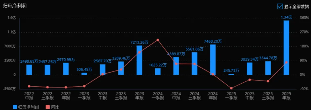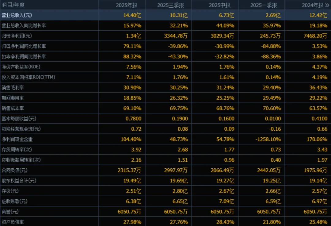 2025年归母净利润为 1.34亿元,相较于2024年的7468.20万元,大幅增长79.11%。评价: 利润增速显著高于营收增速,说明公司盈利能力大幅改善,可能得益于费用控制、产品结构优化或规模效应释放。