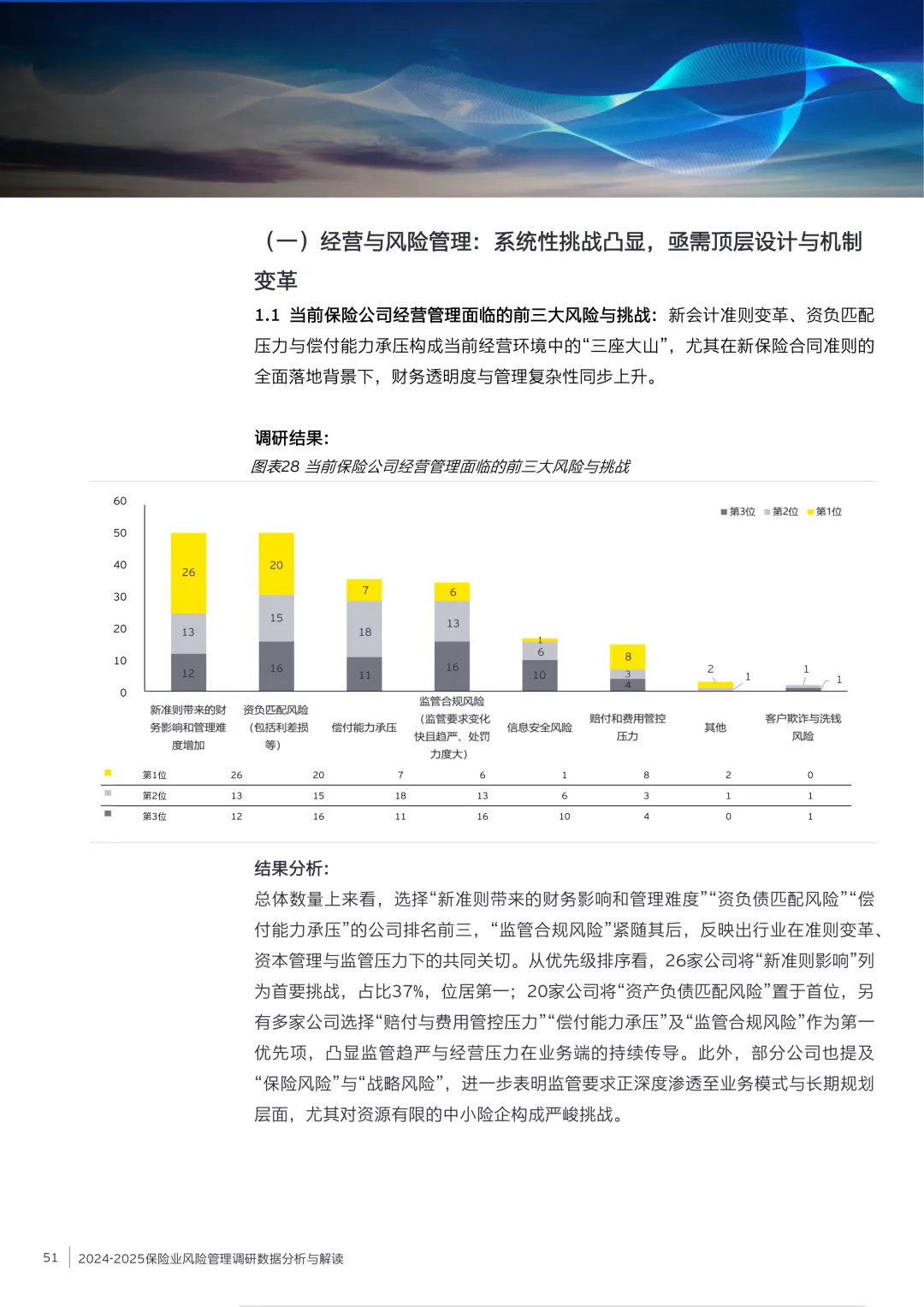 1.1当前保险公司经营管理面临的前三大风险与挑战:新会计准则变革、资负匹配压力与偿付能力承压构成当前经营环境中的“三座大山”,尤其在新保险合同准则的全面落地背景下,财务透明度与管理复杂性同步上升。