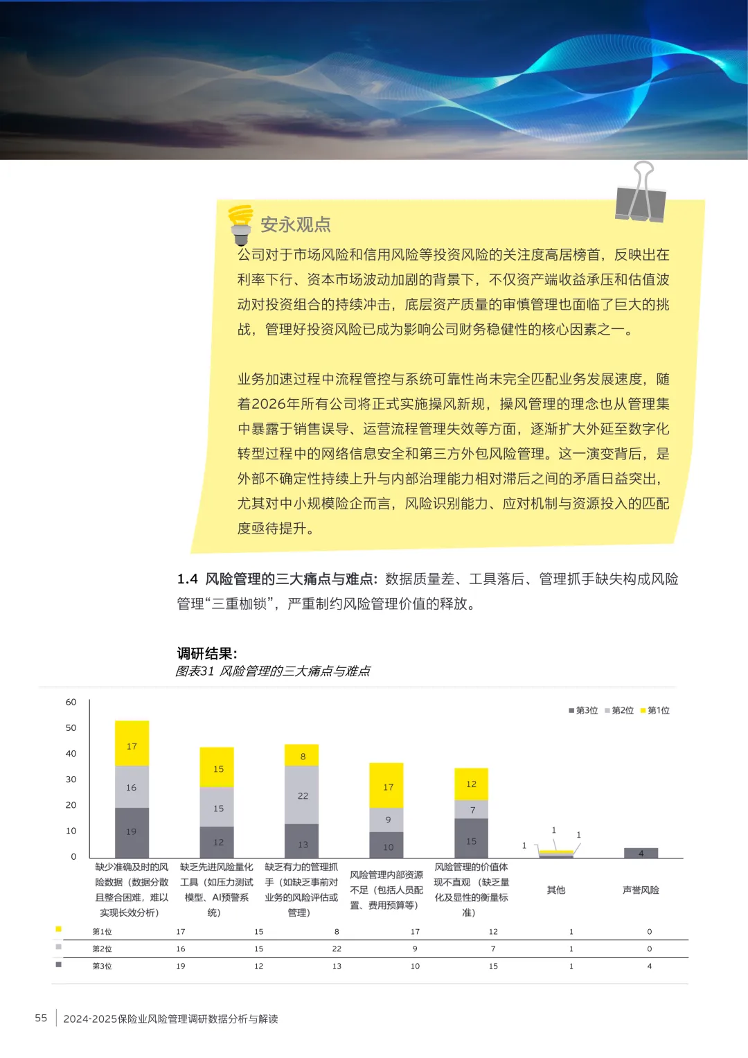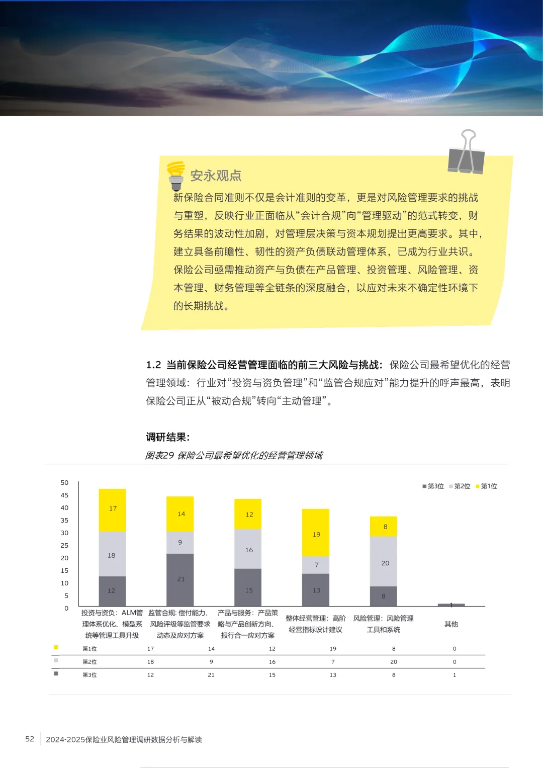 1.2当前保险公司经营管理面临的前三大风险与挑战:保险公司最希望优化的经营管理领域:行业对“投资与资负管理”和“监管合规应对”能力提升的呼声最高,表明保险公司正从“被动合规”转向“主动管理”。