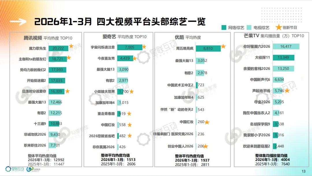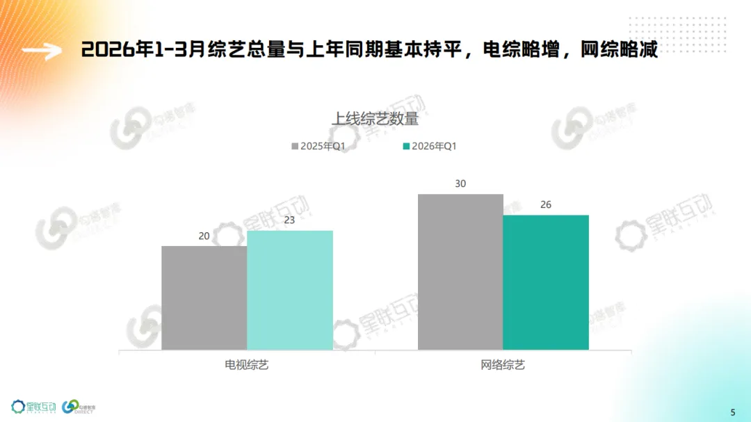 1、2026年1-3月 综艺与上年同期持平,电视综艺23部,数量略增,网络综艺26部,数量略减。综 N 代电综增多、网综减少,新节目以网综为主数量略减。