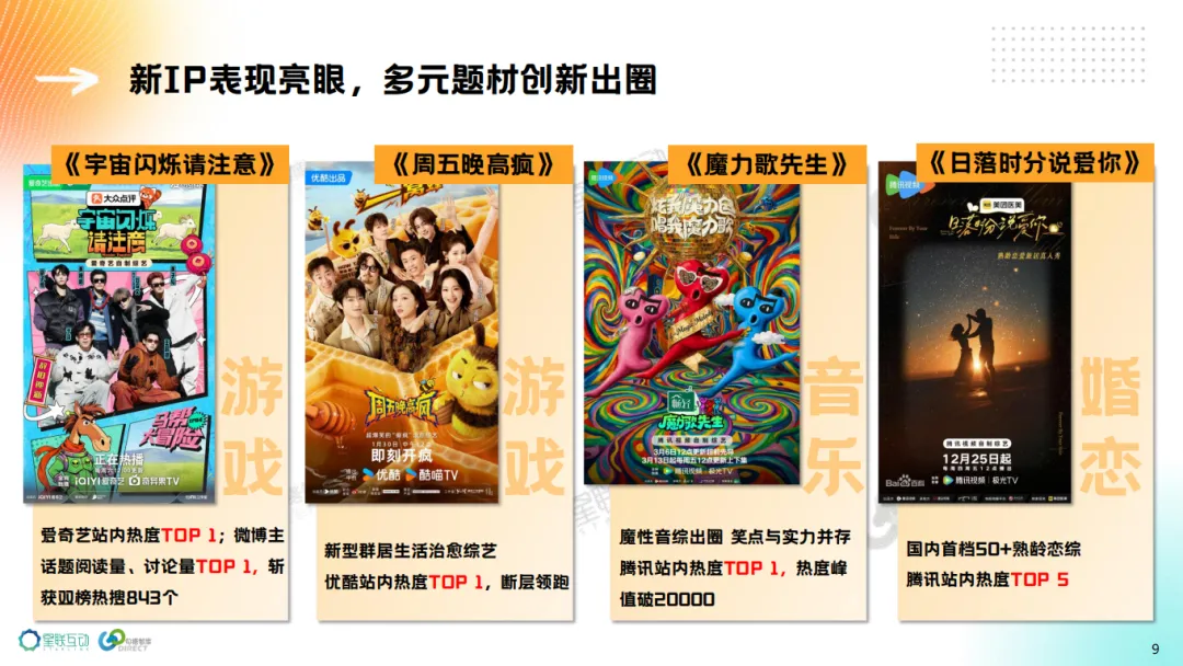新综艺表现亮眼,《宇宙闪烁请注意》《魔力歌先生》《周五晚高疯》平台热度名列前茅。