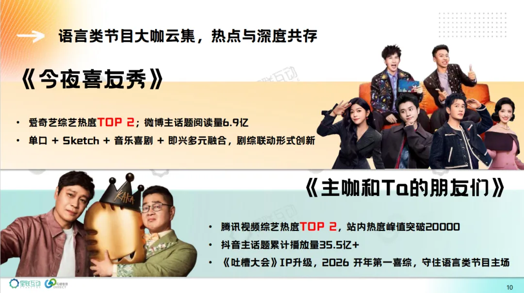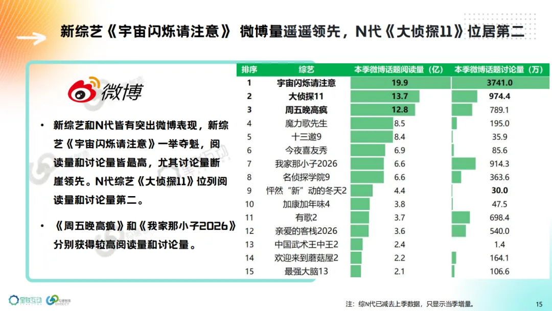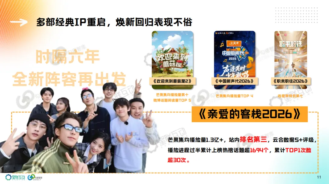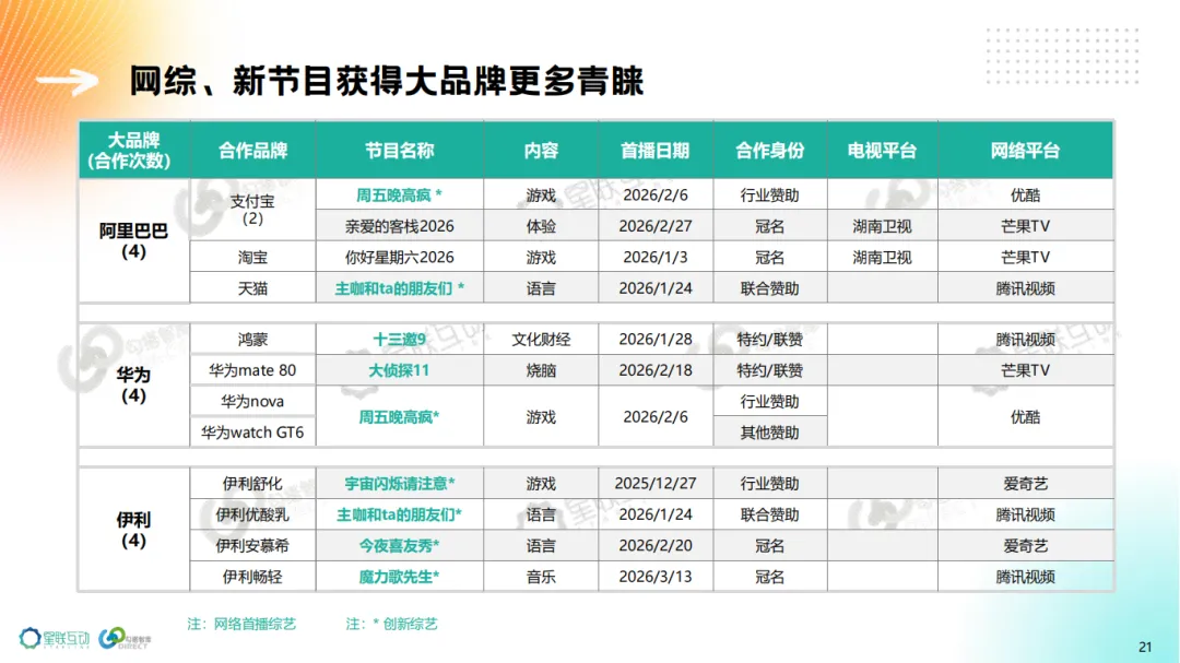3、电综N代《亲爱的客栈2026》、网综游戏类新节目《宇宙闪烁请注意》《周五晚高疯》赢得最多品牌合作。