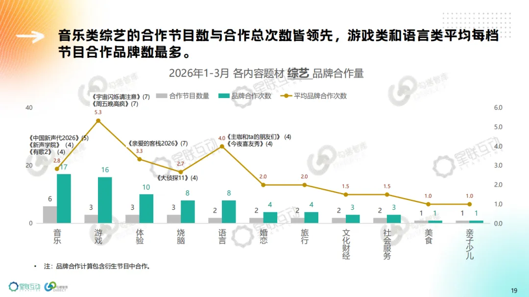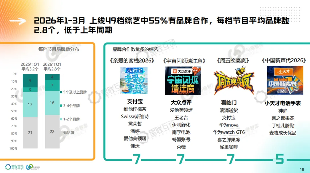 2026年1-3月 上线49档综艺中,55%有品牌合作,每档节目平均品牌数2.8个,低于上年同期。