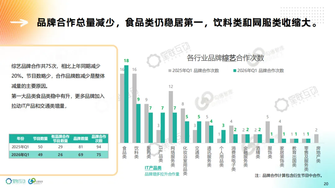 综艺品牌合作共75次,合作总量减少,食品类仍稳居第一,饮料类和网服类收缩大。