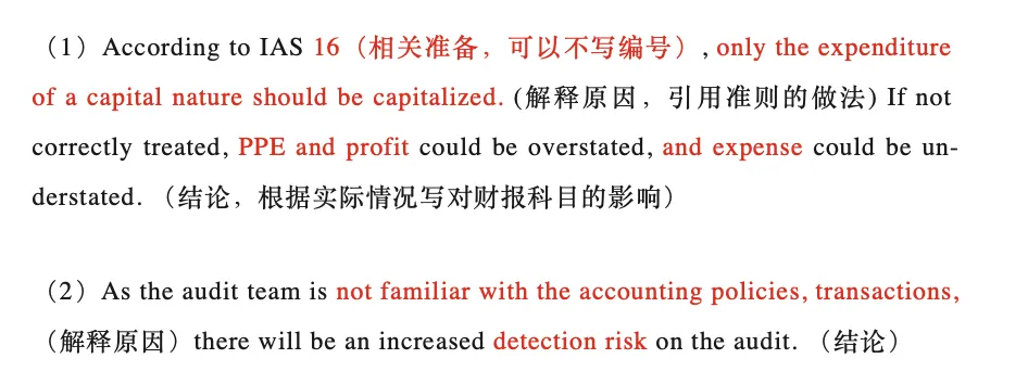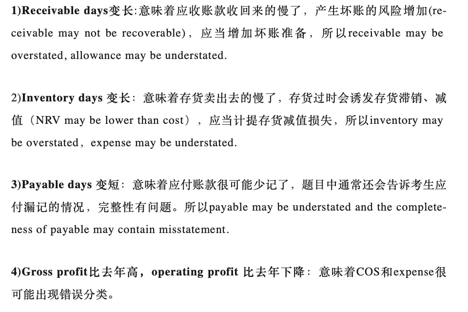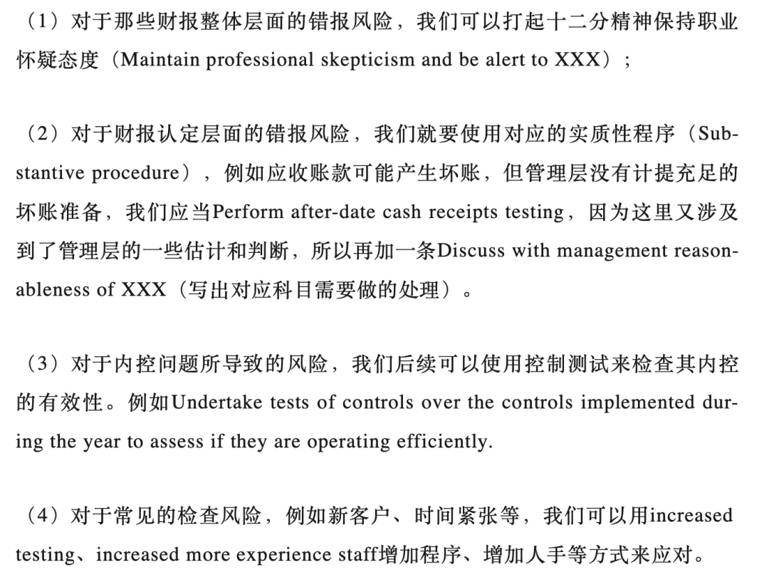 可参考下方两种常见的解释套路:(标红部分可根据题目情况替换,黑体部分为模板)??易错点Tips:解释对科目的影响时,不要写科目的大类、要写具体的科目,比如认为PPE有问题,就直接写PPE,不要写成ASSET,否则不得分!Q3:Response到底怎么写?感觉跟SP很像,傻傻分不清?首先考生要明白Risk assessment风险评估到底是在干啥:它存在于审计的计划阶段,是前期审计师刚开始了解被审计公司的一个阶段,这时候你拿到了财报,结合了解到公司经营的一些情况,利用职业怀疑态度我们发现了一些会对财报产生影响的风险,那接下来我们要怎么做呢?Audit response实际上就是我们如何去应对风险、后续要怎么开展审计工作的一个规划。因此:?Q4 题目有时候让算一些ratio,这些比率与审计风险的题有关系吗?当然有!考官让你算ratio,其实就是让你执行审计计划阶段的分析性程序,我们要根据计算出来的比率变动,结合题目中给出的信息进一步分析风险所在。用于解释审计风险。常见的考点如下:?Q5 考场上可不可以多写几个风险,考官看了多给我点分?请停止你的幻想!考官在报告中明确表示,题目让写几个风险就写几个,写多的根本不会看!只会浪费你自己的时间,请广大考生珍惜自己的答题时间,把自己最有把握的考点写在答卷上哦~除了上述考试易错点分析之外,贝卡还为大家准备了“Audit risk-通关秘籍”(私信领取),帮助大家在考前再抢几分!各位同学,加油哦~私信领取完整版《Audit risk-通关秘籍》?—————————————————
