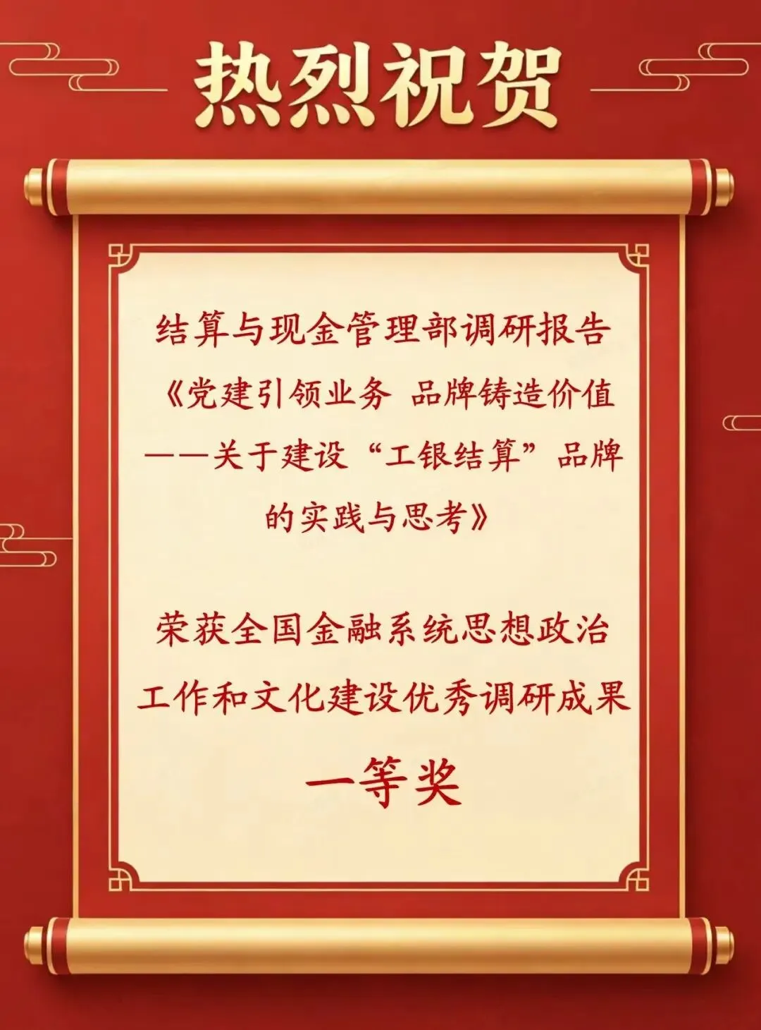 近日,中国金融思想政治工作研究会(金融政研会)发布《关于2025年度全国金融系统思想政治工作和文化建设优秀调研成果的通报》。结算与现金管理部报送的调研报告《党建引领业务 品牌铸造价值——关于建设“工银结算”品牌的实践与思考》,在全国各金融机构报送的1813项调研成果中脱颖而出,荣获一等奖。