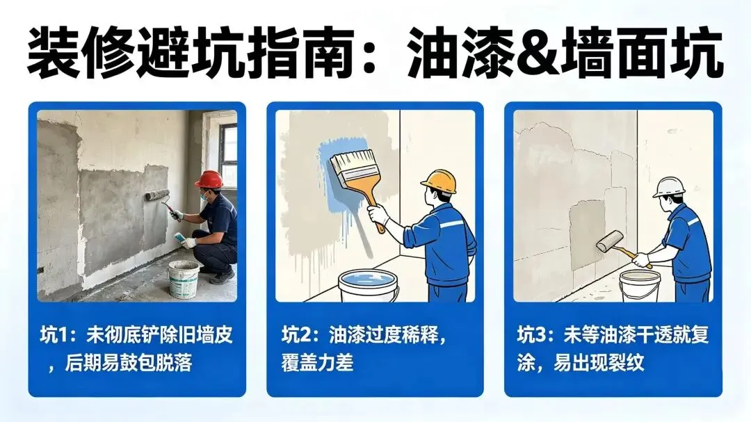 坑:基层没处理、腻子没干透就刷漆 解:挂网防裂,每遍工序干透再下一步