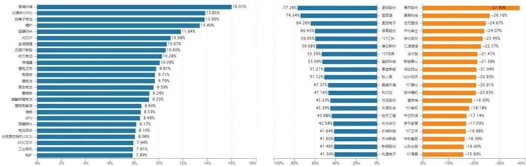 上周市场回顾:谈判一波三折,市场分化加剧。周一,玻纤概念大涨,锂电表现加强,存储芯片继续活跃,光通信内部轮涨。周二,光通信分歧,算力、商业航天走强,存储芯片继续活跃,锂电股尾盘暴力拉升。周三、医药股逆势爆发,商业航天继续活跃,国产芯片异动。周四、创业板刷新11年新高,算力租赁爆发,锂电、光通信强势反包。周五、光通信加速、玻璃基板封装、PCB双双大涨,固态电池午盘拉升。