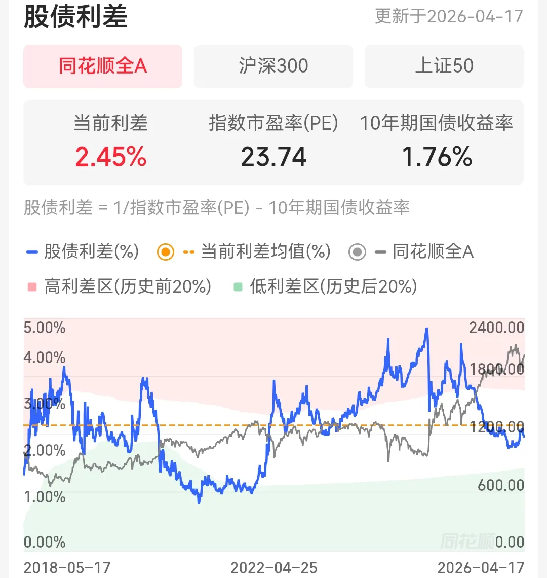 中长期看多,现阶段股债利差较大。截至4月17日同花顺全A当前的股债利差2.45%,位于利差均值附近区域,性价比有所降低。股债利差越大,则配置股票的性价比越高,股债利差越小,则投资股票的性价比越低。当前市盈率PE23.74倍,10年期国债收益率1.76%。