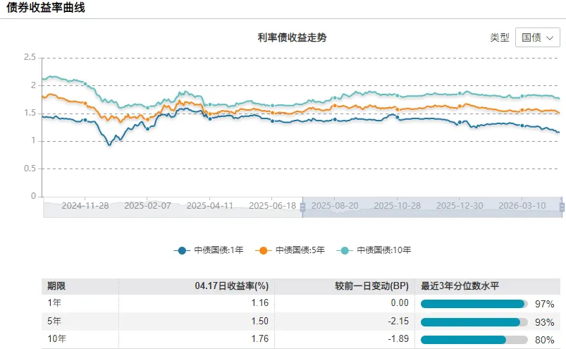 上周债市整体走强,各期限收益率均大幅下行并逼近阶段性新低。周中公布的3月金融数据表现偏弱,社融与信贷增速放缓,叠加此前出口增速不及预期的情况,市场对经济修复的斜率产生一定担忧,促使资金从股市流向债市避险,推动国债期货快速拉升。