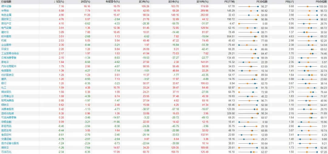 行业表现:上周涨幅前三位:硬件设备、半导体、有色金属。跌幅前三位:石油化工、煤炭、医疗设备与服务。
