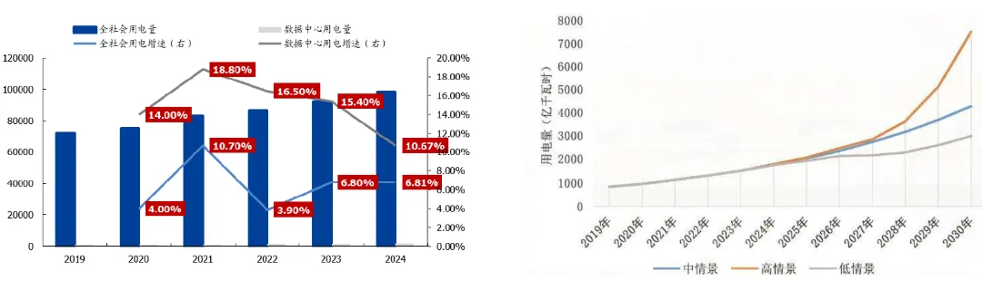算力中心用电增速远高于全社会用电量增速,算力用电占全社会用电量的比例持续上升。据中国信息通信研究院测算,2024年全国数据中心用电量为1660亿千瓦时,同比增长10.7%,同期全社会用电量增速为6.8%。