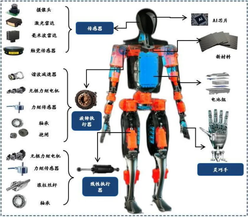 ”肢体”硬件是人形机器人实现所有拟人载体和基础,主要包含执行器、传感器、 灵巧手、电源、芯片和新材料结构件等。关节执行器即机器人一体化关节,是影响机器人硬件成本和运动性能的关键部分。旋转执行器多用于人形机器人关节处,如手腕、膝关节,主要由电机和减速器组成,核心零部件是无框力矩电机、行星减速器/谐波减速器等。