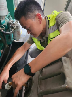 8月2日下午接到任务后,成德南公司绵阳管理处机电技术员张中近丢下碗筷即刻出发,快速到达现场,开始检修,为尽快“对症下药”自己俯低身体检查机油,排尽空气,手动不断加压,不一会儿全身便已湿透。