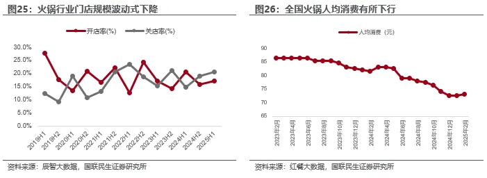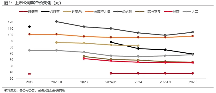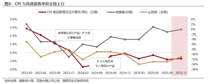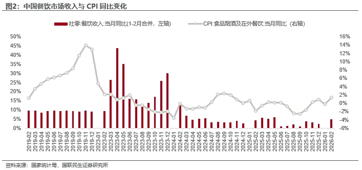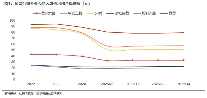 餐饮供需变化:淘汰加剧、价格企稳。2023年来,餐饮行业经历系统性客单价下移,消费者主动降级+品牌降价行为共同压缩了客单价空间。但从趋势来看,根据龙头调价动作及行业层面的红餐网数据,2024年下半年-2025年行业价格降幅有明显收窄趋势。结合2026年2月的数据显示,CPI回升至1%左右,餐饮收入增速回升,或预示着价格压力的边际改善,餐饮业利润有望迎接修复。同时,2023年来,餐饮门店平均存续周期降至15-16个月,新开业的餐饮商家面临出清压力; 2025年全国餐饮新注册门店约240万家,进场情绪有所退潮。行业发展趋势:外卖增量、效率革命。欧睿数据表明,2014-2025年间中国餐饮业线上点单占比持续提升,2025年线上点单比例已达29%,上市餐饮企业该趋势演变更为剧烈。可预见的时间维度内,我们认为外卖占比的继续提升是大概率事件,我们以平价中式正餐模型为例,测算外卖占比对OPM的影响。根据测算,25%-35%附近水平为外卖扩张红利期;外卖占比合理扩张上限约为35%-40%;若外卖占比突破40%,外卖收入增长则是以OPM换取规模,且利润代价随外卖占比升高加速放大。在前端场景转变的同时,炒菜机器人和智能化系统带来后厨效率革命,有效减少了出餐时间与人力成本。动态更新:海底捞向好变化。海底捞每一轮人事的变革都对应公司战略方向的调整。此次创始人重回掌舵,有望依托其深厚的餐饮从业经验和管理洞察力、强执行号召力和资源调用能力,在存量竞争时代,把控战略方向,稳住主品牌发展,加速第二曲线成长节奏。从公司经营跟踪来看,主品牌维度,2024年下半年海底捞客单价同比企稳,2026年春节假期客流上行,实现良好开局;新品牌方面,新品牌覆盖火锅、寿司、烤肉、小火锅等多个餐饮行业大赛道,具备较大的扩张潜力。同时,公司已展现出通过高比例派息回馈股东的意愿,随着分红力度的加大,公司的股息率从早年的不足1%大幅提升至近年的5%左右,安全边际优势提升。投资建议:2023年后,中国餐饮企业估值快速回落,目前行业估值整体处于低位。结合此前分析,餐饮行业价有企稳、量有修复,餐饮消费边际向好,我们认为优质龙头公司业绩兑现的置信度更高,建议关注:锅圈、绿茶集团、海底捞等。风险提示:宏观经济与消费意愿波动风险,市场竞争加剧风险,原材料上行风险,食品安全风险。人均消费出现企稳上行信号。2023年来,餐饮行业经历系统性客单价下移,消费者主动降级+品牌降价行为共同压缩了客单价空间。2023年-2025年,餐饮行业人均消费支出持续收缩,援引红餐大数据,2025Q4餐饮大盘在33元附近,较2022年下滑24%,各业态人均消费均有下滑。而就餐价格的走低更明显制约了餐饮收入增速。但从趋势来看,由于龙头主动调价等因素,2024年下半年及2025年行业价格降幅有明显收窄趋势。结合2026年2月的数据显示,CPI回升至1%左右,CPI涨幅创3年新高,餐饮收入增速回升,或预示着价格压力的边际改善,餐饮业有望迎接修复。上市公司数据显示,堂食客单价降幅收窄,底部企稳。从上市公司层面数据来看,除西式快餐领军企业肯德基近年客单价维持在约38元水平,其他餐饮业态龙头企业客单价均有不同程度压力。2023-2025年间小菜园/绿茶/怂火锅/太二/海底捞餐厅客单价降幅分别为-14%/-12%/-8%/-6%/-2%,与体感略有不同的是大众便民中式餐饮龙头反而价格压力最大。从经营近况观察,2024-2025年间海底捞大陆餐厅客单价基本维持在95-96元的区间内,2025年全年客单价止跌企稳;2024-2025年间绿茶集团堂食客单价维持在58元左右。