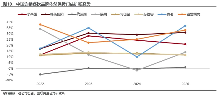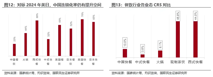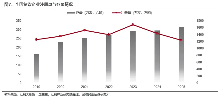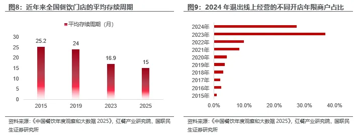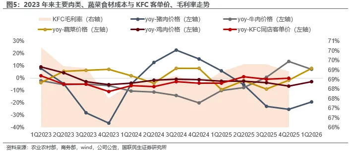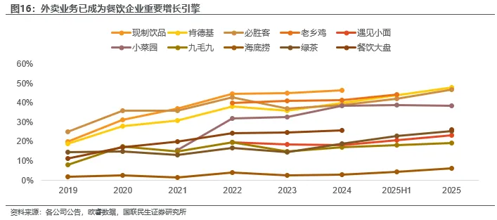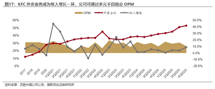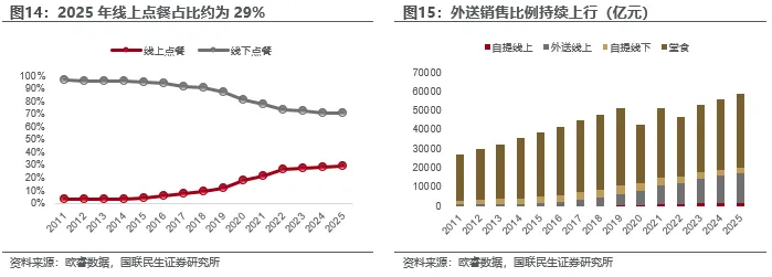 食材成本变动,影响可控。2025Q4至2026Q1,牛肉、蔬菜等核心食材价格同比增长,但涨幅温和,且2026Q1牛肉价格涨幅有所回落。同期鸡肉、猪肉价格仍在负增长区间内,结合餐饮端单价企稳,我们预计纯食材成本上行带来的餐饮端压力可控。进场情绪略退潮,存量门店迭代加速。回顾近几年中国餐饮市场供给变化,2023年市场呈现报复性开店态势,当年全国新增注册餐饮相关企业超过328万家。但在需求走弱,供给非理性扩张背景下,迎接高速开店而来的是大量关店,2023-2025年间餐饮门店平均存续周期降至15-16个月,新开业的餐饮商家面临出清压力,餐饮业迎来快速行业更替与结构性调整。2025年全国餐饮新注册门店约240万家,进场情绪有所退潮,存量门店净增99万家规模收窄。连锁化率螺旋式上升。在餐饮市场大量开店大量闭店的浪潮中,中国连锁餐饮企业依托自身在规模、供应链、品牌方面的多维优势,在更迭加速的市场环境中实现优于行业的生存周期和逐步上行的市占率。但横向对比来看,当前中国餐饮市场连锁化率较低,仍有较大提升空间。2024年中国内地连锁餐厅按收入计仅占所有餐厅的23.3%,较美国的59.2%及日本的52.3%展现出庞大的增长潜力。餐饮行业集中度也是如此,2024年中国内地餐饮百强公司占中国内地餐饮市场总收入约10%,而在美国,餐饮百强公司占餐饮市场总收入约30.0%。线上化率持续提升,外卖业务已成为餐饮企业重要增长引擎。欧睿数据表明,2014-2025年间中国餐饮业线上点单占比持续提升,2025年线上点单比例已达29%,其中外送比例为26%。上市餐饮企业该趋势演变更为剧烈,2023年来,头部餐企外卖收入占比持续提升,2025年的“外卖大战”进一步加速结构演变,目前部分餐饮企业销售占比已超50%,百胜中国、小菜园、绿茶集团等企业近年外卖销售额占比明显提升。可预见的时间维度内,外卖占比的继续提升是大概率事件,而外卖占比的持续上行如何影响同店增长、定价及利润率,我们尝试从餐饮企业的长短期结合数据入手分析影响。首先,关注外卖大战对餐饮行业的影响,1)由于数据可得性问题,我们援引复旦大学《“赚了流量,赔了利润”——补贴大战如何累及餐饮商户?》的普适性研究结论:持续大额补贴下,外卖经营“以价换量”的增收效果不佳,且因为对堂食形成明显的替代效应导致餐饮商户总利润下滑。2025年7月以来竞争加剧期,商户日均总订单量平均增长7%,但实收金额平均下降约4%;基准情形下估算,竞争升温期/加剧期商户总利润平均下降约1.7%/8.9%。2)但从上市企业数据判断,头部餐饮企业的结论略有不同,主要在于增收效果,外卖占比提升对上市餐企来说确实短期拉动了流量指标,不过同步且持续地压低了盈利水平。如瑞幸咖啡财报表明,外卖大战驱动营收增长,但相关配送费成本的大幅上行严重挤压了利润空间。进一步,拉长周期来看,外卖占比上行并非必然对应利润受损,从百胜中国2017年来的数据看,肯德基外卖占比从2017年约12%一路攀升至2025Q4约42%,外卖占比呈现趋势提升。但与瑞幸咖啡等公司不同的是,百胜中国在骑手成本上升的背景下仍保持了利润率的稳定。我们认为背后反映了通过自有渠道建设掌握定价权的重要性,也可能存在外卖收入增加带来的规模议价能力和成本控制措施。
