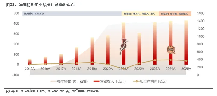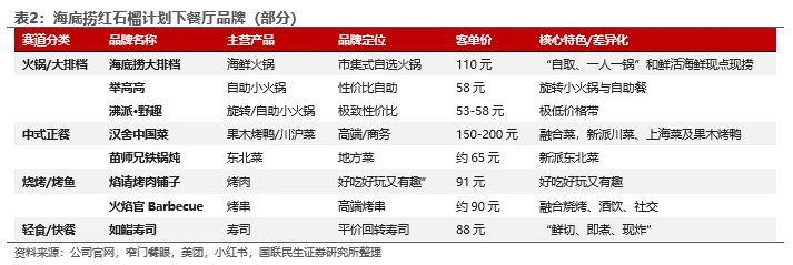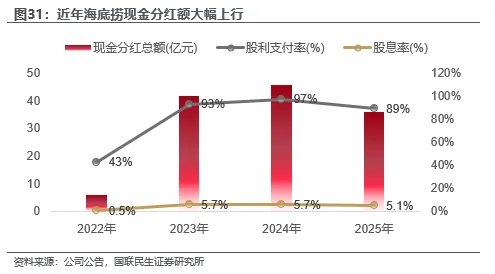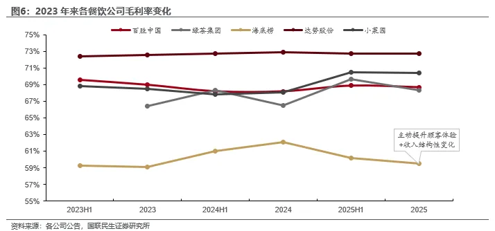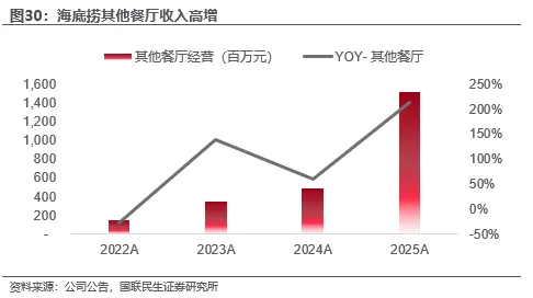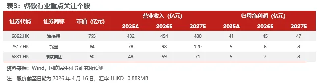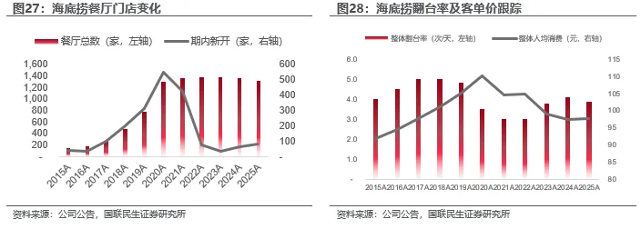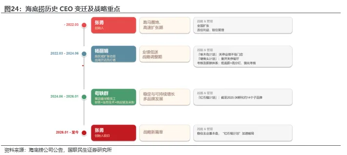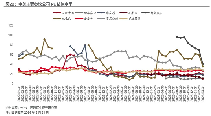 2.2 技术革新:智能化带来后厨革命引入炒菜机器人和智能化系统,后厨效率革命。伴随技术的发展变革,餐饮门店逐步引入炒菜机器人,此类设备实现了标准化操作流程,有效减少了出餐时间与人力成本。尤其在快餐等高出餐量场景中,炒菜机器人可全天候稳定运转,既缓解了厨师短缺的用工压力,也降低了因操作差异导致的口味波动。在连锁餐饮中,小菜园2023年期开始应用炒菜机器人,以提高店内工作流程的自动化。2026年,锅圈旗下快餐餐饮品牌家“锅圈小炒”门店在河南郑州试营业,锅圈小炒以餐饮逻辑+工业化手段解决在家吃饭的效率问题,消费者通过小程序“线上下单、线下取餐”,门店2名员工可操作3至4台设备,炒菜设备最快2-3分钟完成一道菜品,大幅提升了餐饮后厨效率。在行业趋于“质价比”和原材料波动的双重压力下,供应链能力成为决定企业盈利韧性的核心变量。上市餐饮公司深度布局供应链夯实核心竞争力,小菜园马鞍山中央工厂预计2026上半年投产,全链路智能化管理;锅圈采用“单品单厂”策略,对集团主要产品的生产及供应实现严格控制。截至2025年12月31日,锅圈共拥有7个食材生产厂,形成品类齐全、分工明确的产能矩阵。复盘2022年至2026年初中美餐饮公司估值走势,中美餐饮企业PE估值呈现分化格局。横向对比来看,2022年中美头部餐饮企业估值差距尚不突出,但2023年后,中国餐饮企业估值加速向下,而美国餐饮公司估值相对坚挺。从当前估值来看,1)麦当劳与百胜餐饮PE估值徘徊在25X-35X间,2)美国成长型餐企,墨式烧烤快速扩张期PE估值维持在50-70区间高位,当前估值中枢有所回落,整体韧性较强。中国餐饮企业PE估值方面,九毛九经历大幅下探后有修复;海底捞于2023年中剧烈波动后趋于平稳;绿茶集团、小菜园近期估值压缩至10X左右。关注中国餐饮板块需求端实质性改善后的估值修复。餐饮行业是劳动密集型产业,组织与管理的能力决定高质量连锁扩张的空间。从海底捞的发展中,我们可以窥见:人事变革与战略转变相伴相生,一位向心力强大的领导者对于餐饮行业具有重要影响力。2026年1月,公司公告创始人张勇先生回归CEO岗位,重新掌舵公司。我们复盘前几轮公司CEO的变迁,每一轮人事的变革都对应公司战略方向的调整。1)在张勇先生在过往担任海底捞CEO期间,其领导了公司上市与门店高速扩张,通过供应链、服务与管理体系的标准化建设,实现了品牌的规模化复制,夯实了海底捞成为火锅行业的绝对龙头。2)杨利娟时期,其带领集团超预期地完成“啄木鸟”和“硬骨头”计划,奠定了公司健康发展及可持续增长的局面。3)苟轶群时期,其在精细化管理基本面业务的同时,推动创业创新与数字化发展,红石榴计划孵化多元子品牌。创始人具备深厚的餐饮从业经验和管理洞察力,以及更强的执行号召力和资源调用能力,本次回归有望把控战略方向,稳住主品牌发展,加速第二曲线成长节奏。在餐饮市场中,消费者口味切换极快,单一品牌发展面临高不确定性。一旦主品牌进入成熟期或衰退期,业绩会快速萎缩。而多品牌发展可有效对冲单品牌的生命周期风险和天花板问题,复用供应链与后台资源,平台型餐饮企业享有更高估值。海底捞作为头部餐饮企业,较早布局多品牌策略:主品牌客单价企稳回升,2026年客流实现良好开局。从公司经营跟踪来看,2024年下半年海底捞客单价同比企稳,2025H1公司客单价为98元,同比增长1元左右,延续2024年下半年来的回升态势。虽然同店在客流增长承压背景下仍有压力,但2026年春节假期客流上行,实现良好开局;全年维度,随高基数影响逐步消退,海底捞的客单价和翻台率有望回升,带动公司业绩水平改善。根据我们测算,翻台率向上带来的经营利润提升空间可观。主品牌之外,探索第二成长曲线是餐饮企业突破单一品牌生命周期和估值天花板的必答题。海底捞也很早就涉足多元品牌的探索,目前公司红石榴计划下涵盖海底捞大排档、如鮨寿司、焰请烤肉铺子,举高高小火锅等多元品牌,这些新品牌覆盖火锅、寿司、烤肉、小火锅等多个餐饮行业大赛道,具备较大的扩张潜力。2025年,公司其他餐厅经营收入为15.2亿元,同比高增215%。成熟期提供更高的股东回报。海底捞的利润分配政策经历了从拓展留存转向高比例分红的转变,2015至2020年期间,公司倾向于留存收益以支撑门店扩张,股利支付率最高为2019年的31.2%;但是从2023年开始,当公司处于稳定发展阶段,公司转向高比例的分红政策,当年股利支付率跃升92.94%,2025年股利支付率在85%+。随着分红强度的加大,公司的股息率从早年的不足1%大幅提升至近年的5%左右。近年来,餐饮行业经历系统性客单价下移,消费者主动降级+品牌降价行为共同压缩了客单价空间。但从趋势来看,结合龙头调价动作及行业层面的红餐网数据,2024年下半年-2025年行业价格降幅有明显收窄趋势。结合2026年2月的数据显示,CPI回升至1%左右,餐饮收入增速回升,或预示着价格压力的边际改善,餐饮业有望迎接修复。就行业发展趋势而言,我们认为1)可预见的时间维度内,外卖占比的继续提升是大概率事件,我们以平价中式正餐模型为例,测算外卖占比对OPM的影响。根据测算,25%-35%附近水平为外卖扩张红利期;外卖占比合理扩张上限约为35%-40%;若外卖占比突破40%,外卖收入增长则是以OPM换取规模,且利润代价随外卖占比升高加速放