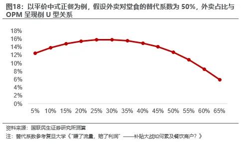 同时,我们以平价中式正餐模型为例,测算外卖占比对OPM的影响。根据我们的测算,该模型下OPM峰值对应外卖占比稳定在25%-35%附近,该水平为外卖扩张红利期;超过35%-40%需关注对堂食的挤出效应;若外卖占比突破40%,外卖收入增长则是以OPM换取规模,且利润代价随外卖占比升高加速放大。