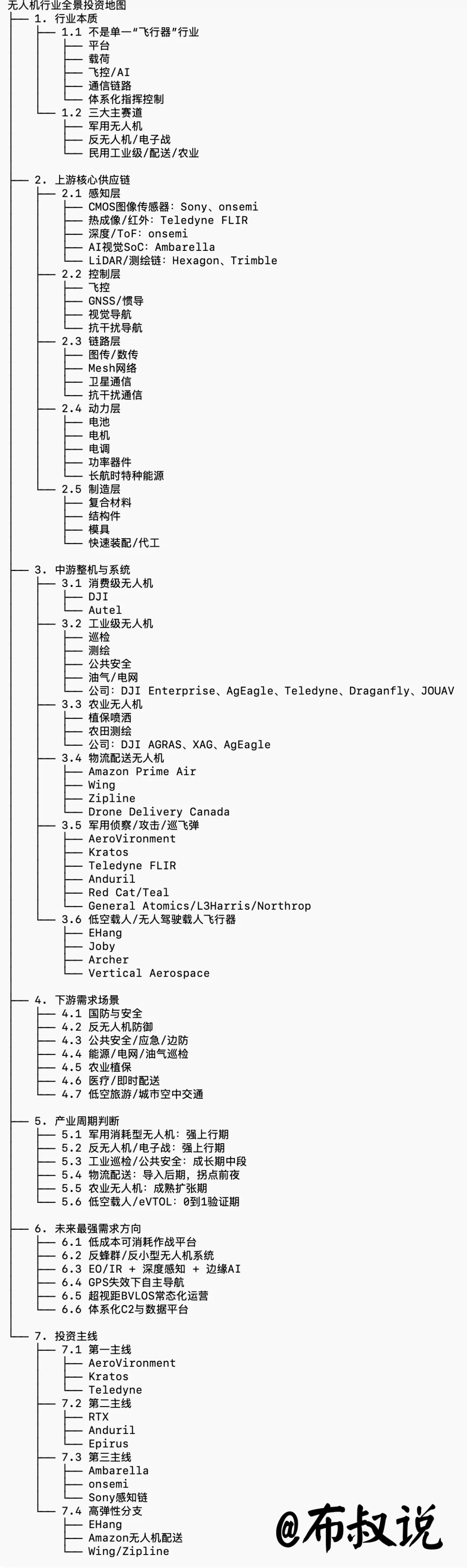 无人机不是一个单一行业,而是三个景气度完全不同的行业叠加: 军用消耗型/察打一体/巡飞弹链条:景气度最高,已经进入“量产+体系化采购”阶段。美国国防部的 Replicator 明确要在多域部署成千上万套自主系统,且第二阶段已把反小型无人机也纳入重点。AeroVironment 的 FY2025 订单与积压明显走强,Kratos 的无人系统收入在 2025 年也保持双位数到高双位数增长,说明军用需求不是概念,而是正在变成订单与产能。 反无人机/电子战/探测拦截链条:这是未来两三年弹性很大的第二主线。因为战场已经从“比谁能飞”升级到“比谁能发现、干扰、诱骗、击落、批量压制”,Anduril、RTX、Epirus 这类公司拿到的项目和合同说明,反无人机已经从边缘能力变成主战场刚需。 民用工业无人机/物流/巡检/农业链条:需求确定,但节奏取决于监管放开 + ROI 验证 + 标准化交付。美国 FAA 仍以 Part 135 和 BVLOS 豁免/规则推进为核心,2026 年还在推进 BVLOS 常态化;欧洲则继续围绕 EASA 的风险分级和 U-space 框架走。这意味着民用不是没空间,而是不是所有细分同时爆发。先爆的是巡检、测绘、公共安全、农业、部分配送。 从投资角度,无人机行业卖的不是“飞行器”,而是五层能力: 第一层:平台 固定翼、多旋翼、垂直起降固定翼、巡飞弹、无人直升机、无人运输机、eVTOL。 第二层:任务载荷 光电吊舱、热成像、LiDAR、多光谱、喷洒系统、物流投送舱、通信中继、电子战载荷。 第三层:大脑 飞控、导航、视觉感知、避障、边缘 AI、自主任务规划、集群协同。 第四层:链路 通信链路、卫星链路、抗干扰、图传、数传、定位与失效备份。 第五层:体系 地面站、指挥控制、空域管理、数据平台、反无人机探测与拦截。 所以真正的核心不是“卖一架机”,而是谁能把平台+载荷+算法+链路+体系做成闭环。DJI 在民用强,就是因为它不是单卖硬件,而是把整套生态做成了标准品;Anduril、AeroVironment、Kratos、Teledyne FLIR 等在军用/政府侧强,也是因为它们更接近体系化交付。DJI 官网也直接展示其在农业、能源、公共安全、测绘等多个行业的企业级方案;EHang 则在低空载人方向推进商业运营;Wing、Zipline、Amazon Prime Air 说明配送方向也在继续扩张。 这是无人机的“眼睛”,也是未来高端化最确定的方向之一。 军用和工业级无人机对低照度、HDR、全局快门、深度感知、红外热成像要求越来越高。Sony 有专门的 Drone 应用页面和工业图像传感器体系;onsemi 直接把 drone 作为独立解决方案场景,强调导航、避障、低光成像和深度感知;Ambarella 则在边缘 AI 视觉 SoC 上强化本地智能识别、障碍感知和实时理解。 代表公司 Sony Semiconductor:CMOS 图像传感器、全局快门、工业视觉 onsemi:图像传感器、深度感知、低功耗视觉链路 Ambarella:边缘 AI 视觉 SoC Teledyne FLIR:热成像、EO/IR、微型侦察系统 Hexagon / Trimble(偏测绘生态):地理空间数据链条 周期位置 军用 EO/IR:高景气上行期 工业视觉 / 避障视觉:成长加速期 消费级普通相机模组:成熟期,价格竞争更大 未来需求判断 未来 3–5 年,最强的不是“更高清”,而是更智能的多模态感知:可见光 + 红外 + 深度 + 边缘 AI 联合。军用和工业巡检会率先付费。 战场经验已经证明,未来无人机不能只靠 GPS。因为干扰、欺骗、失联都在常态化。FAA 推进 BVLOS 时,核心考虑之一也是与现有航空系统的去冲突和安全性;军方的反无人机体系则进一步推动抗干扰、自主返航、视觉导航、地形匹配、备份链路的需求。 代表公司 u-blox:GNSS 模块 Honeywell / Safran / Northrop Grumman(部分领域):惯导、航电、导航 Garmin(更偏航电/导航生态) Anduril / Auterion / Skydio(软件与 autonomy 层) 周期位置 普通消费级飞控:成熟期 抗干扰导航、视觉导航、惯导融合:高成长早中期 未来需求判断 未来高端无人机的核心溢价,不在电机而在失去 GPS 后仍能完成任务。这一层会越来越像“机器人的操作系统”。 无人机从单机走向群体,就必须解决链路可靠性。未来最有价值的是三类链路: 近距高速低时延图传 中距稳健数传 超视距卫星 / 中继 / Mesh 协同 民用 BVLOS、军用集群、边境巡逻、海事监控都依赖这一层。FAA 对 BVLOS 的放开,本质也是在为这类基础能力铺路。 代表公司 Silvus Technologies(私) L3Harris Viasat / Iridium Anduril(C2 + autonomy) Kratos(系统集成) 周期位置 普通图传:成熟期 军用抗干扰 / Mesh / 超视距通信:高景气成长期 无人机行业永恒的物理约束只有两个:续航和载重。 所以高能量密度电池、轻量化材料、高效率电机、功率半导体都很重要。但要注意:这层往往“重要但不一定最赚钱”,因为容易竞争、容易被整机压价。真正具备超额利润的,通常是高端任务场景下的特种电源、混动、氢燃料、长航时方案。 代表公司 Amprius:高能量密度锂电方向 onsemi / Infineon / ST / Navitas(功率器件) T-Motor(非上市,民用电机生态很强) 周期位置 普通锂电/电机:成熟期 长航时、重载、特种能源:成长期 未来需求判断 民用配送和重载运输若大规模起量,这层会明显受益;但当前短中期最强驱动力还是军用消耗型平台和工业高频作业,而不是消费航拍。 无人机想要低成本大规模扩产,结构件、模具、复材、快速装配能力很关键。战争背景下更是如此:当平台变成“可消耗品”,供应链比单机性能更重要。Replicator 本质就是把无人系统从“小而精”推向“多