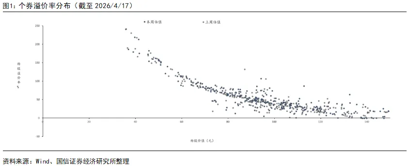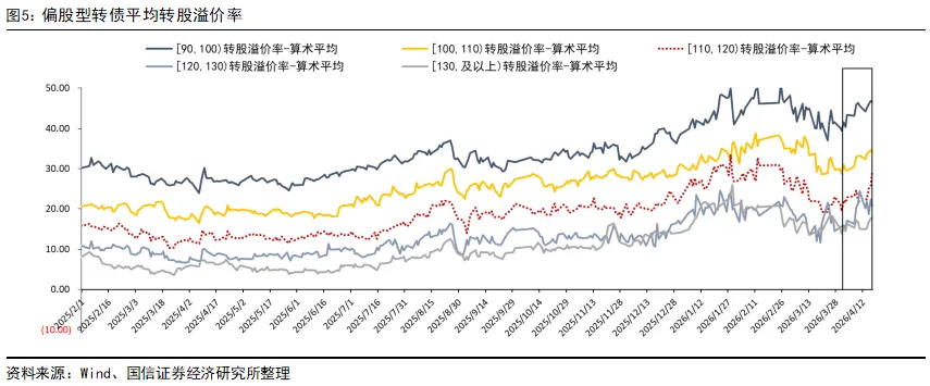 截至上周五(2026/04/17),偏股型转债中平价在80-90元、90-100元、100-110元、110-120、120-130元、130元以上区间的转债平均转股溢价率为56.35%、46.54%、34.07%、29.17%、20.74%、17.86%,位于2010年以来/2021年以来99%/98%、98%/99%、98%/98%、99%/99%、97%/99%、98%/98%分位值。