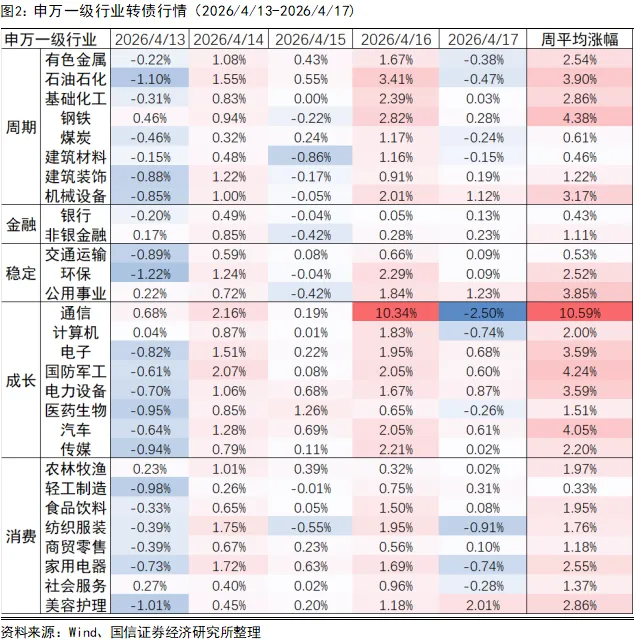 上周转债市场全部行业收涨,通信(10.59%)、钢铁(4.38%)、国防军工(4.24%)、汽车(4.05%)表现居前,轻工制造(0.33%)、银行(0.43%)、建筑材料(0.46%)、交通运输(0.53%)表现靠后。