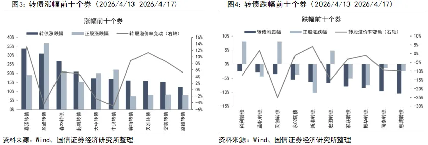 转债市场方面,上周转债个券多数收涨,中证转债指数全周+2.16%,价格中位数+2.29%,我们计算的算术平均平价全周+2.97%,全市场转股溢价率与前周相比+0.39%。个券层面,嘉泽(风电)、盈峰(算力)、春23(消费电子)、起帆(电力电缆)、大中(锂矿)转债涨幅靠前;惠城(废催化剂处理)、闻泰(半导体)、振华(铬盐)、家联(塑料制品)、宏图(遥感)跌幅靠前。