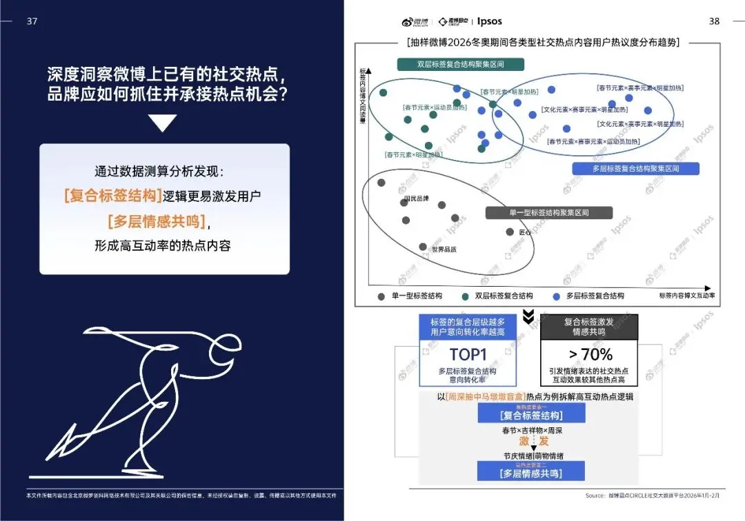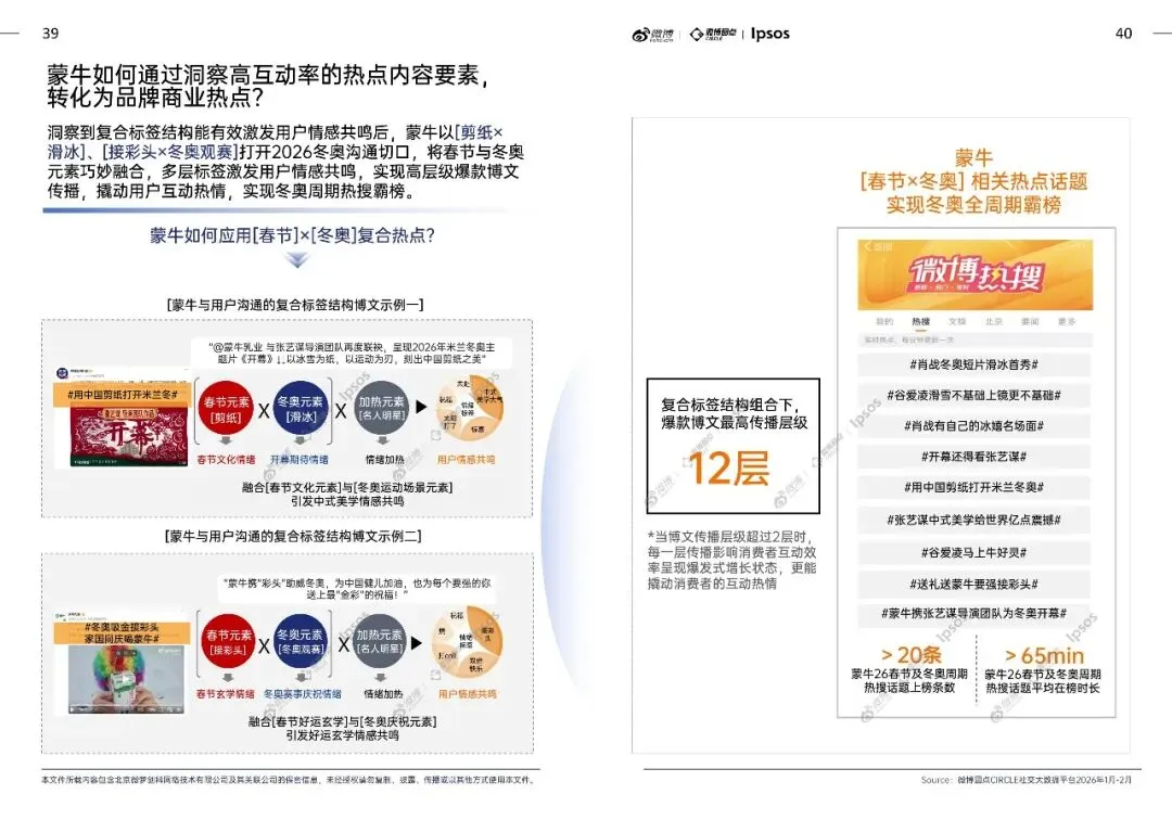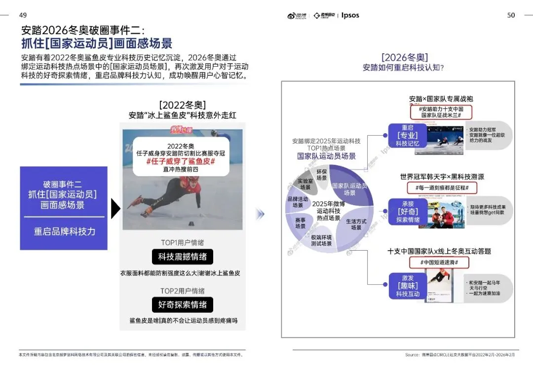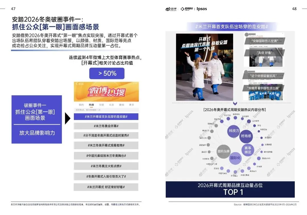 品牌通过微博平台,利用复合标签结构激发用户情感共鸣,实现热点承接与品牌资产积累。蒙牛等企业通过精准捕捉春节与冬奥结合点,成功实现品牌热度放大与用户资产扩容。安踏则通过绑定开幕式、国家运动员等画面感场景,提升品牌社交热度与专业科技认知。
