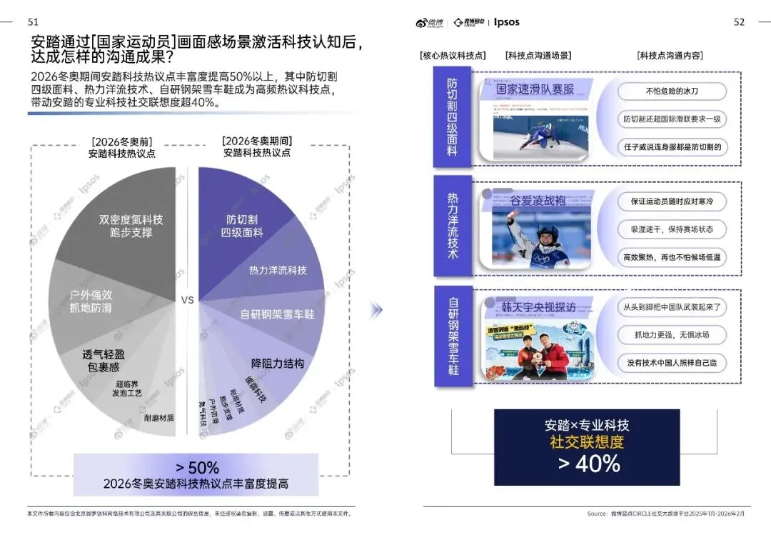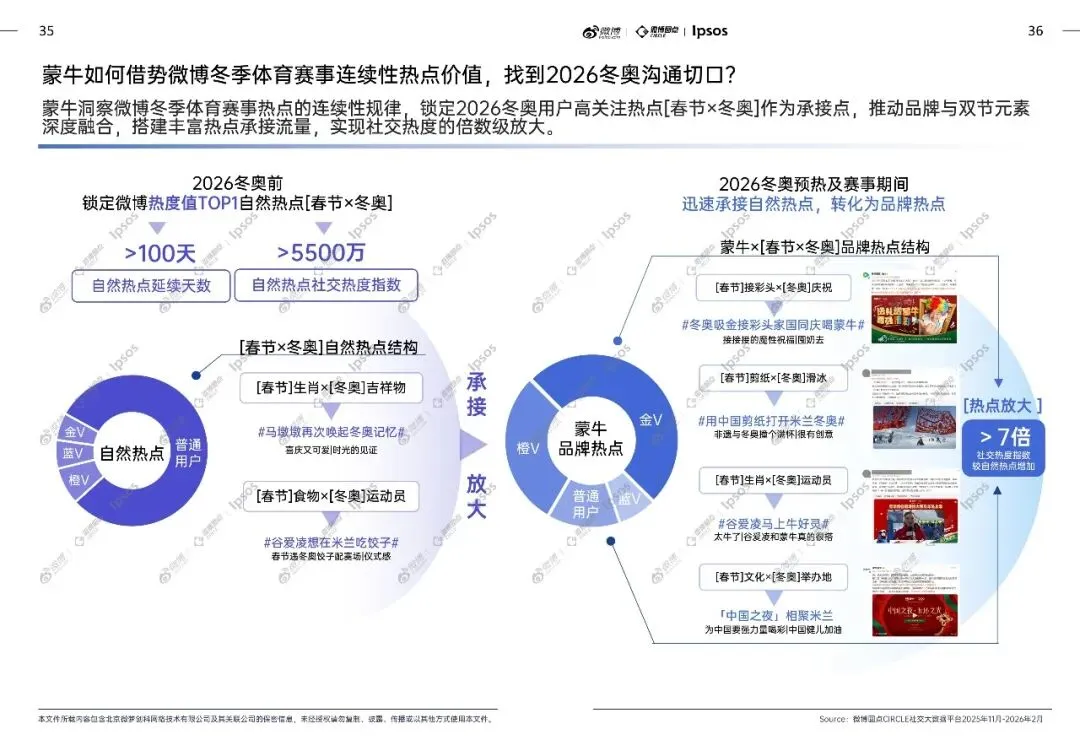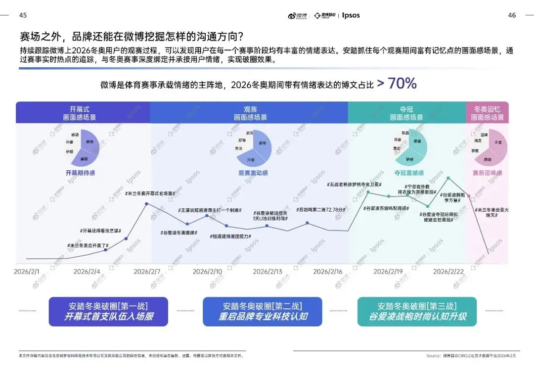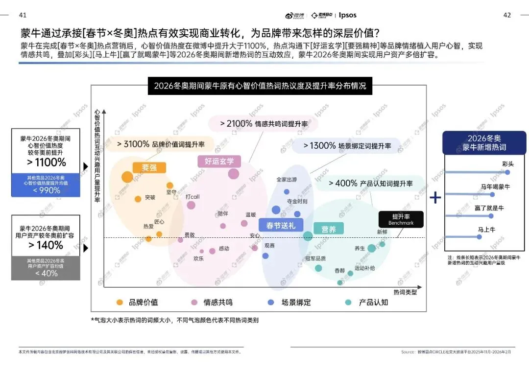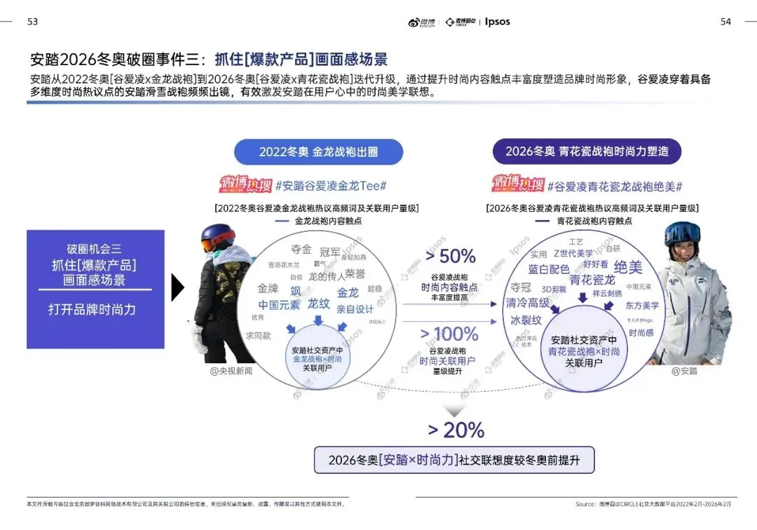 品牌通过微博平台,利用复合标签结构激发用户情感共鸣,实现热点承接与品牌资产积累。蒙牛等企业通过精准捕捉春节与冬奥结合点,成功实现品牌热度放大与用户资产扩容。安踏则通过绑定开幕式、国家运动员等画面感场景,提升品牌社交热度与专业科技认知。