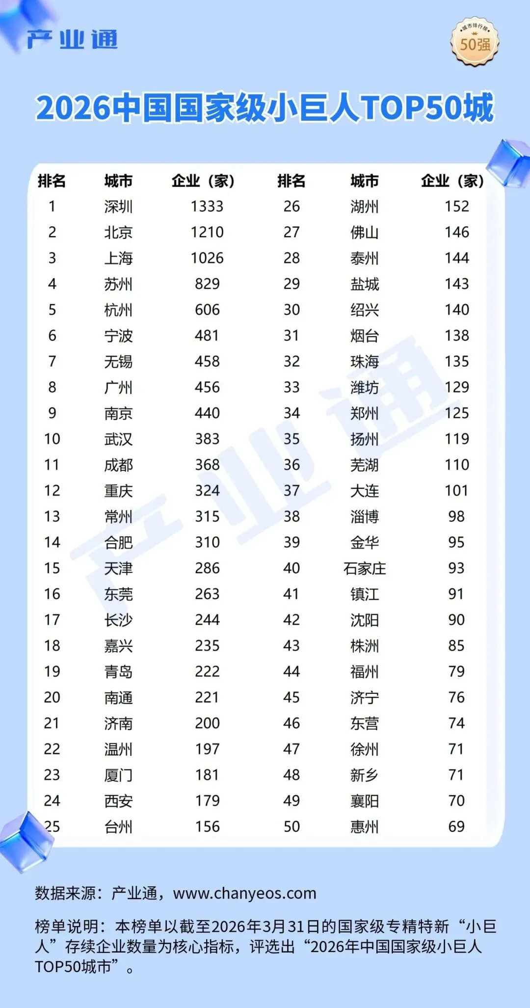 区域分布高度集中,与经济发展水平呈正相关。数据显示,超过70%的“小巨人”企业集聚于东部地区。从省级行政区划看,江苏省(2936家)、广东省(2610家)、浙江省(2169家) 位列前三,与我国经济总量排名高度重合,表明雄厚的经济产业基础是培育专业化企业的先决条件。在城市层面,深圳市(1333家)、北京市(1210家)、上海市(1026家) 构成第一梯队,展现了顶尖城市在集聚创新要素方面的绝对优势。
