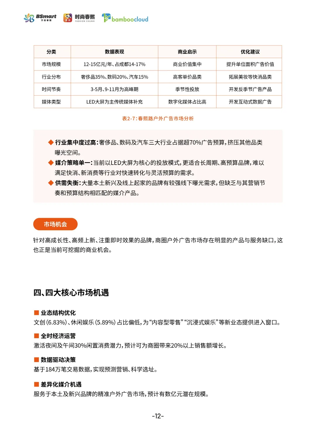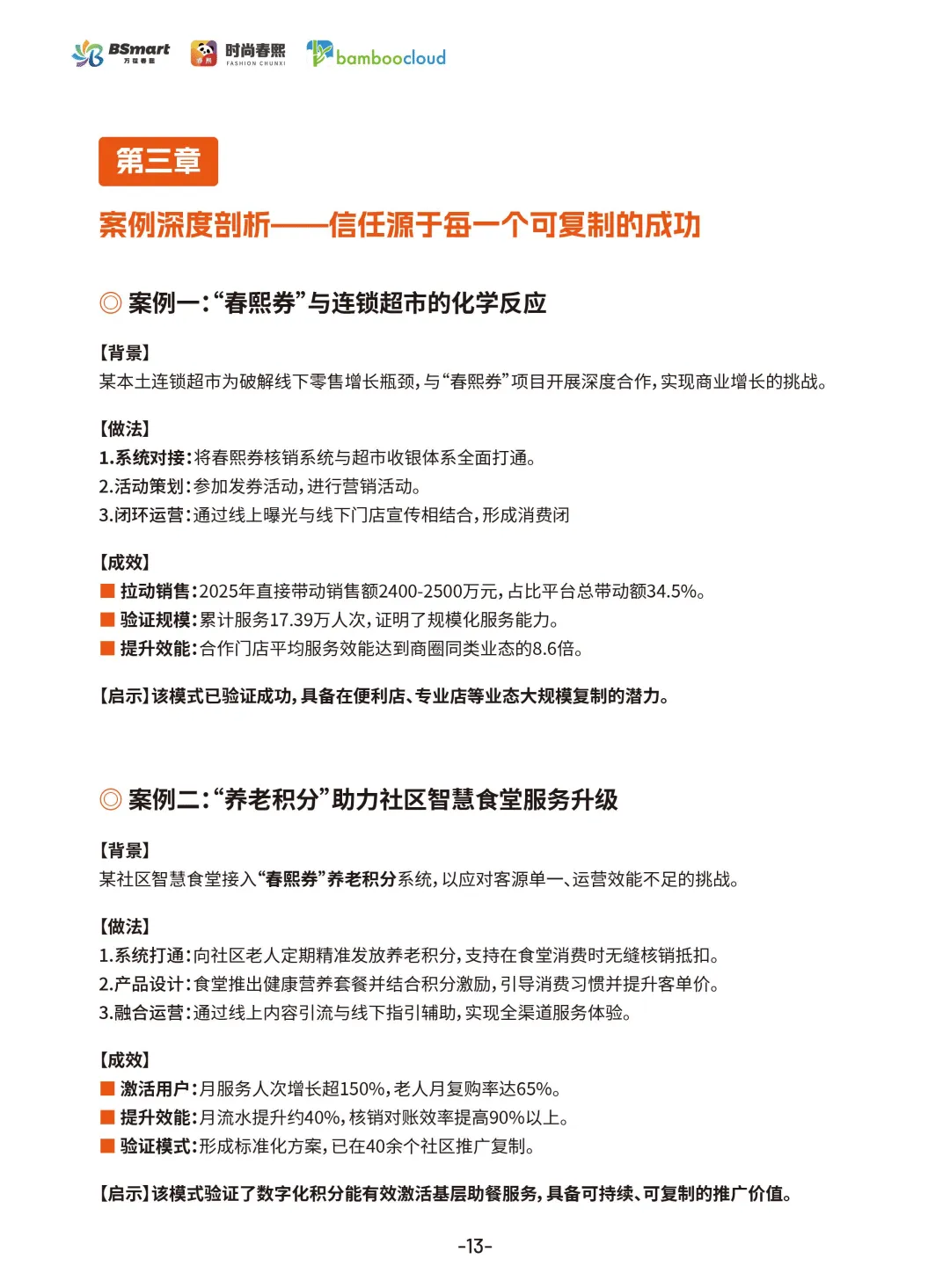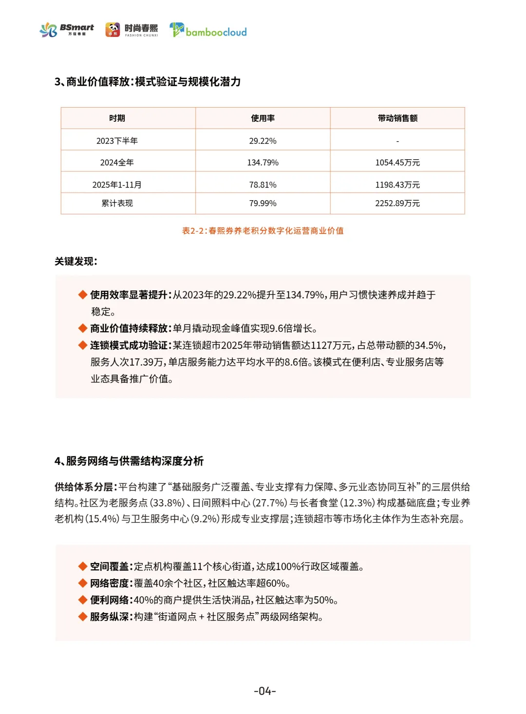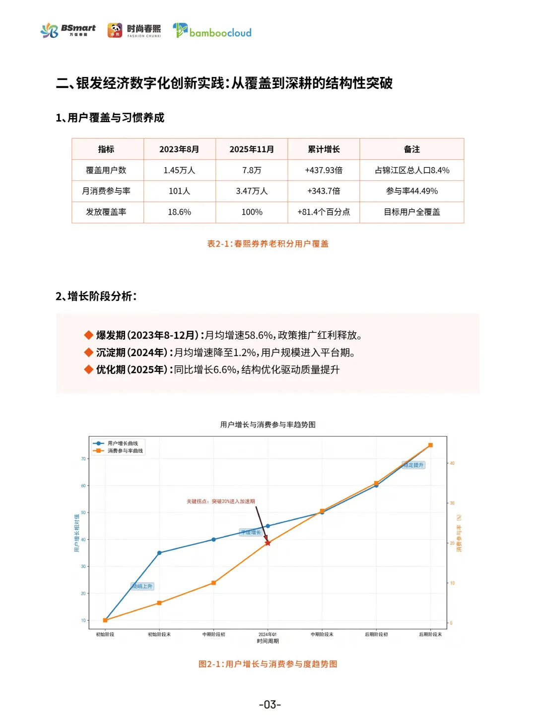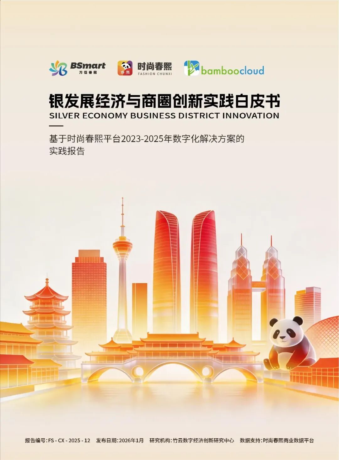 本白皮书是时尚春熙平台2023-2025年银发经济与商圈数字化实践报告,由竹云数字经济创新研究中心发布。平台以技术赋能、数据驱动、生态协同为理念,构建数字化商业新模式,服务7.8万银发客群,数字化工具使用率79.99%,带动商户销售额增长2252.89万元,促成商圈交易超184万笔、消费额超1.6亿元。银发服务呈现基础助餐占比高、助浴助医等专业服务稀缺的结构特点,平台通过春熙券、养老积分等实现供需精准匹配与支付创新;商圈存在业态不均衡、夜间经济薄弱等问题,AIGC赋能使商户内容生产效率提升60%。平台形成可复制实践案例,提出2026-2028年聚焦银发经济、商圈数字化、政企协同三大赛道,开放共建生态,旨在推广模式、完善服务体系,打造有温度的数字商业生态。