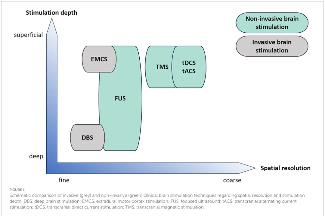 经颅超声刺激是可无创、高分辨率、深靶点精准调控脑功能的超声神经调控技术,与经颅磁刺激(TMS)、经颅电刺激(tDCS)等传统无创技术相比,实现三大核心突破: