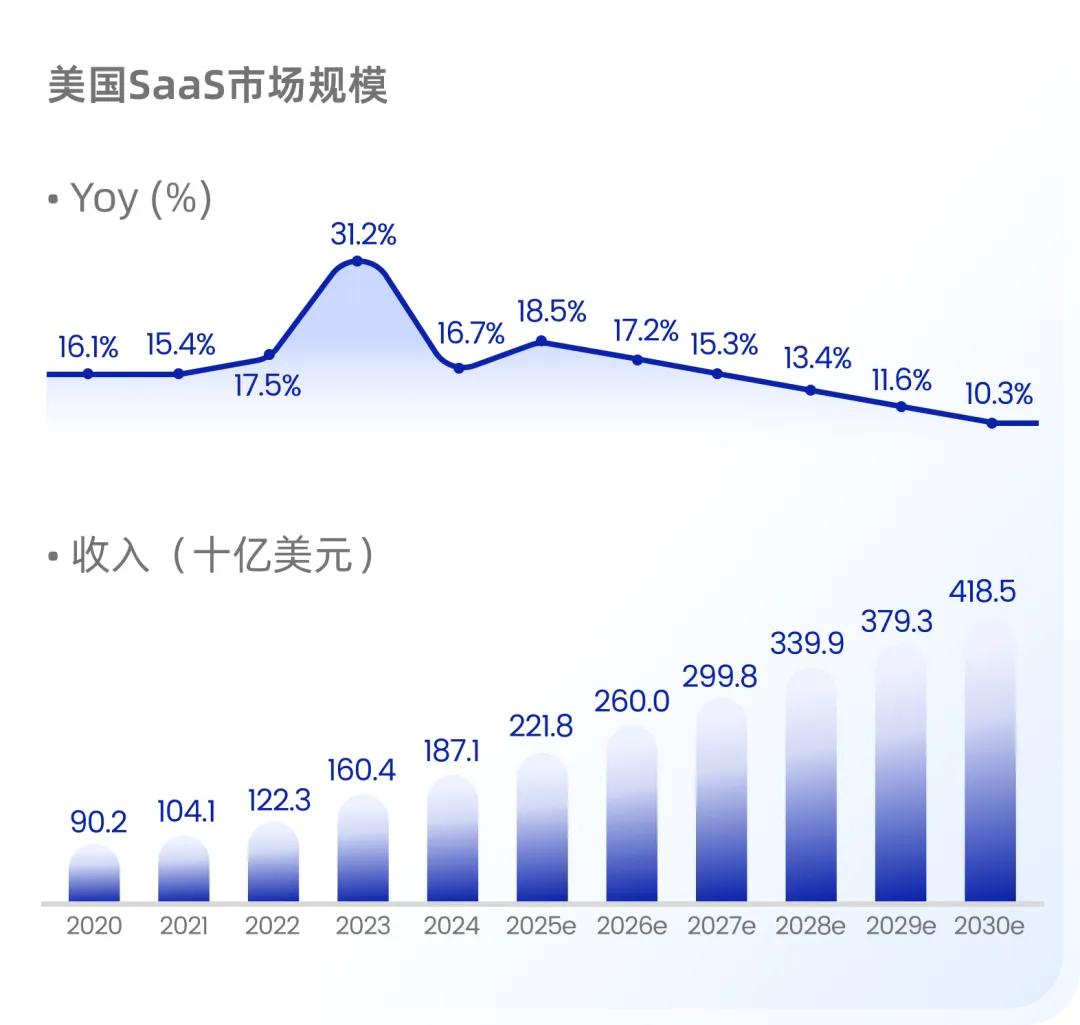 最成熟的 SaaS 市场美国,无疑定义了 SaaS 的行业范式全球领先的云基础设施高度成熟的企业付费意愿17,000+家厂商构成的活力生态系统然而——市场规模预计突破 4000 亿美元的繁荣之下AI 技术浪潮正在重塑格局中小企业高流失率困扰、“双向挤压”已然形成