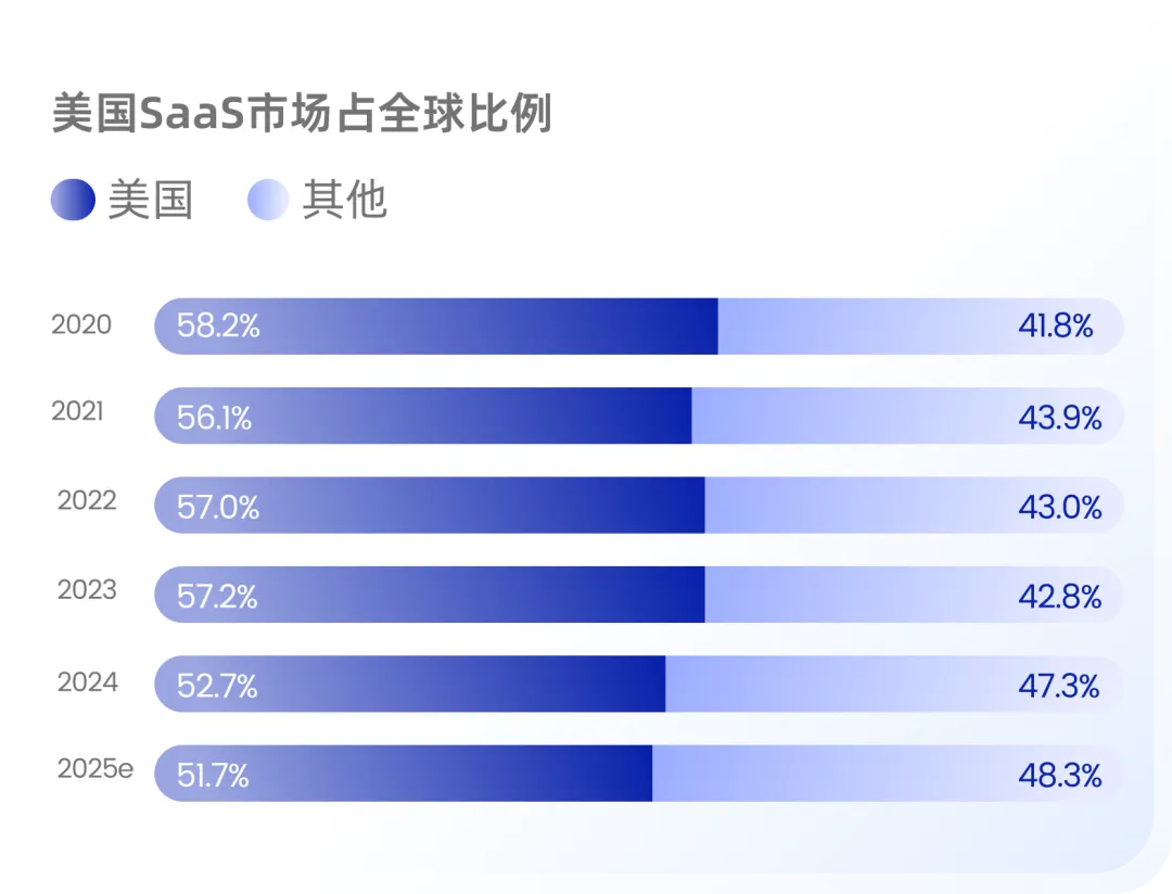 在全球格局中,美国 SaaS 市场长期占据主导地位。2020-2025 年,美国 SaaS 收入占全球市场的比例维持在 51% 以上,相比之下,其他地区的市场规模虽在快速增长,但仍远低于美国市场,反映出美国在云计算基础设施、企业软件应用普及率及企业数字化转型速度方面的全球领先地位。