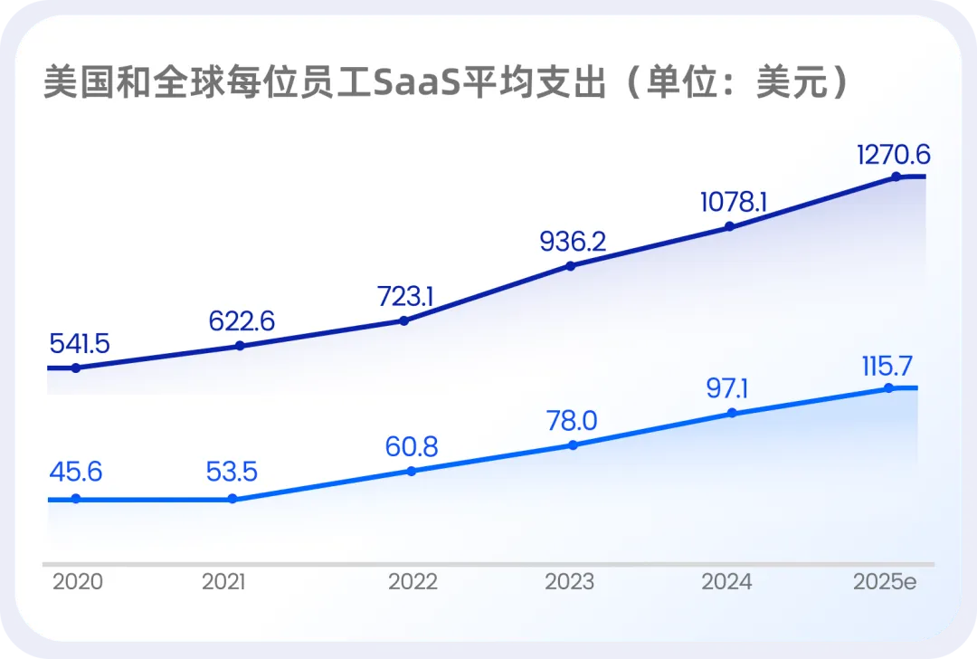 2020 年至 2025 年,美国企业的人均 SaaS 支出从 541 美元提升至预计的 1270 美元,五年增长超过 130%。