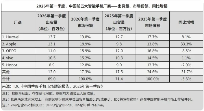 结果:华为Q1国内出货量同比增长7%,登顶市场第一;苹果国内出货量暴涨42%;小米国内出货量暴跌35%,跌出第一梯队。