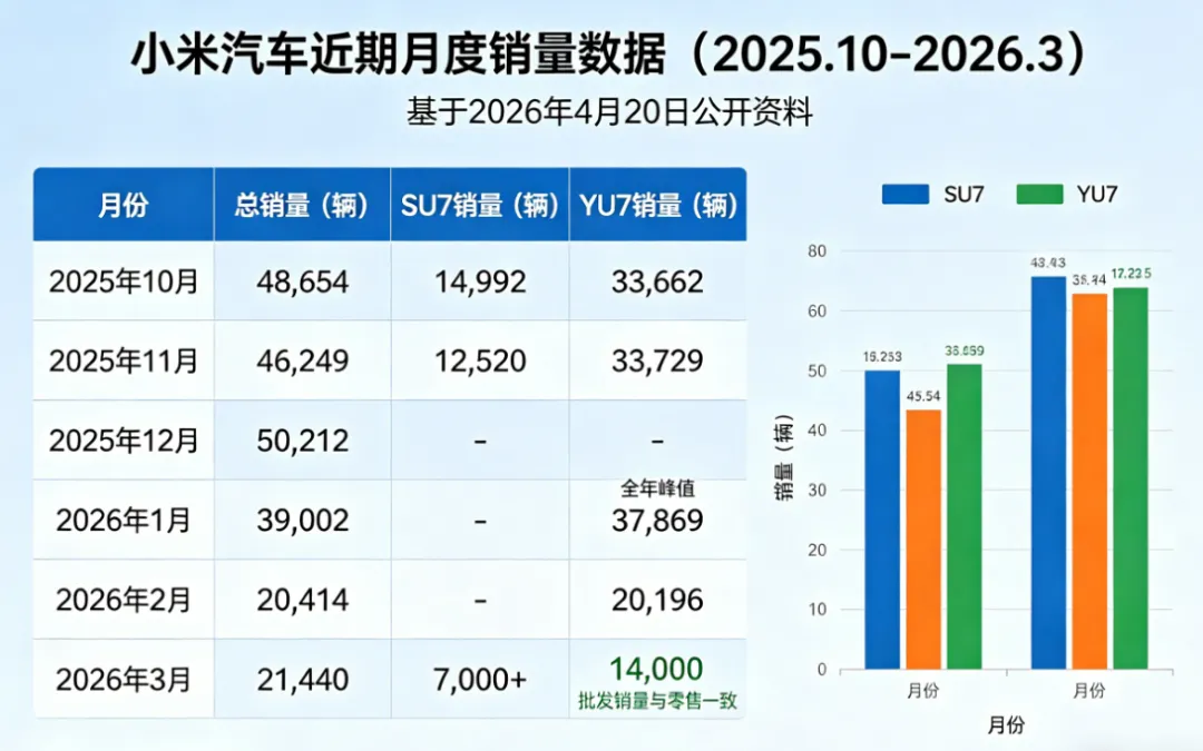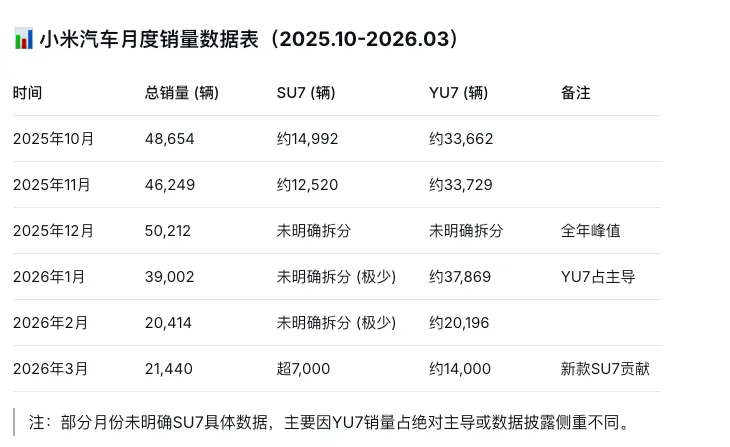 汽车数据:2026年Q1累计交付7.9万辆,仅完成年度55万辆目标的14%。YU7从峰值3.9万台暴跌至1万台,跌幅64%。SU7在停产前夕2月销量仅218辆,同比下滑99.1%,库存积压超1万辆。