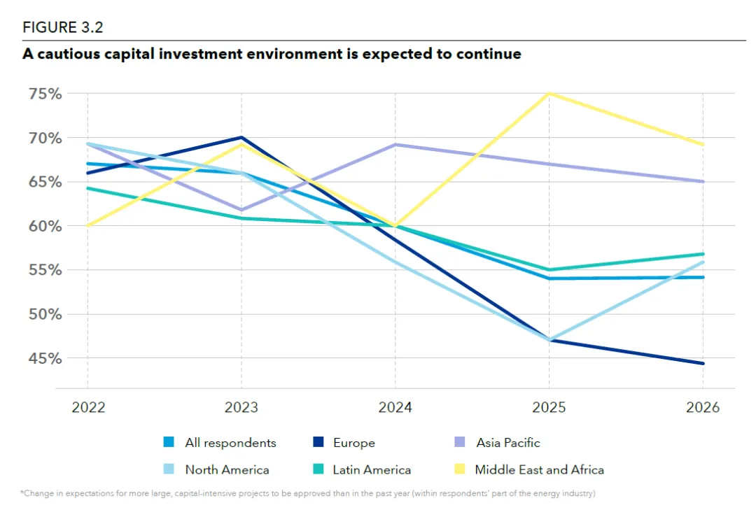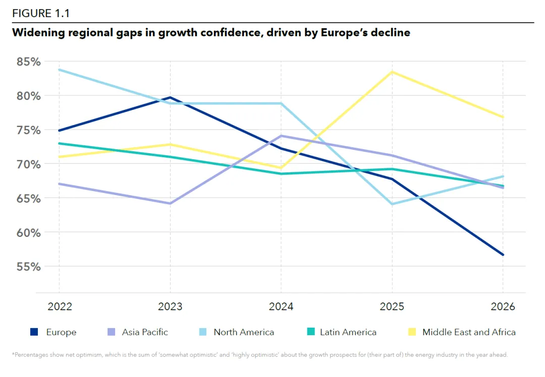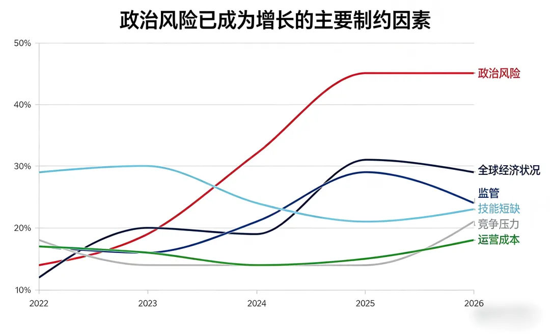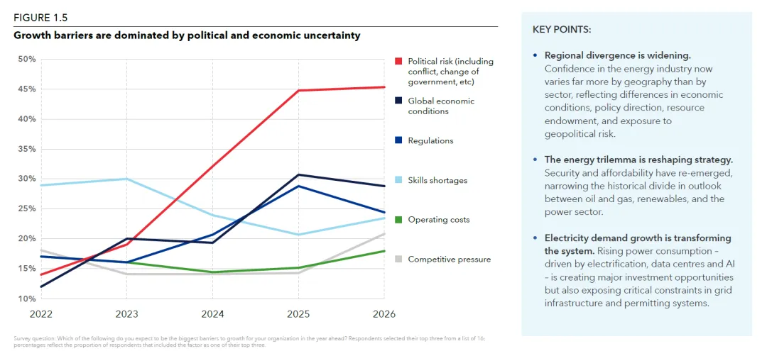 地缘政治紧张局势持续升级、全球经济波动不断加剧,正显著压制能源行业的整体增长预期。政治风险与全球经济形势成为目前被行业提及最多的增长制约因素,不仅直接影响着市场投资信心,更从根本上重塑了能源行业的战略优先级。
