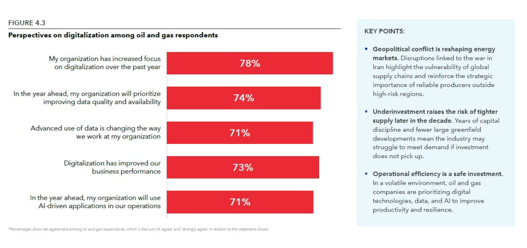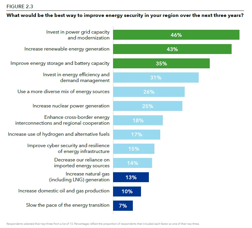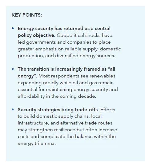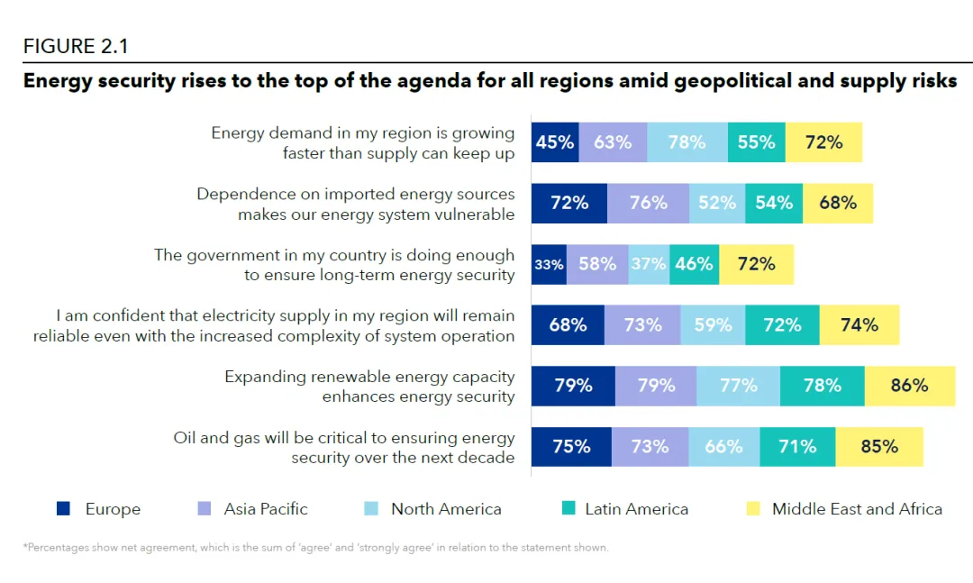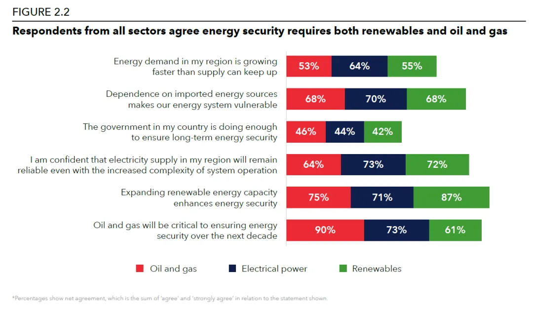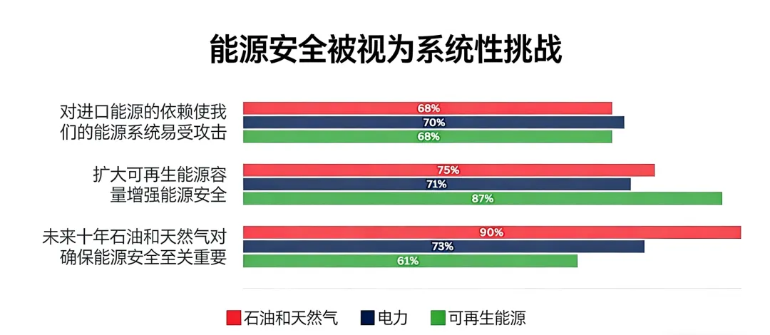 这一共识打破了能源行业传统的领域壁垒:油气领域的受访者普遍认为,扩大可再生能源装机规模对提升整体能源安全至关重要;而可再生能源领域的受访者也明确认可,未来十年内,油气能源仍将是保障全球能源安全的关键组成部分。