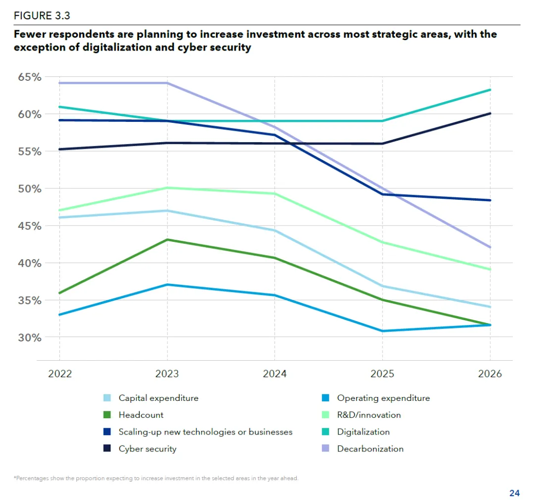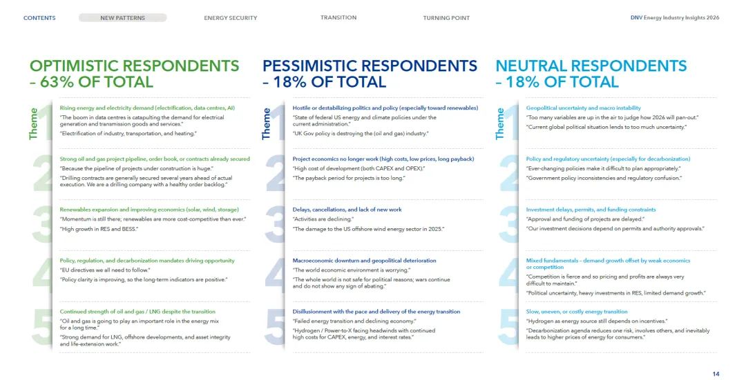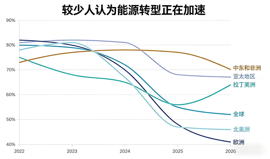 目前仅有52%的全球受访者认为能源转型仍在加速推进,这一比例较2022年的80%出现大幅下降。这一数据看似预示着能源转型步伐放缓,但背后的行业真相并非如此——调研数据清晰表明,能源转型正从激进推进转向务实发展路线,行业领军者在坚守长期脱碳目标的同时,已将安全、可靠、清洁的能源稳定供应列为现阶段的核心优先事项。