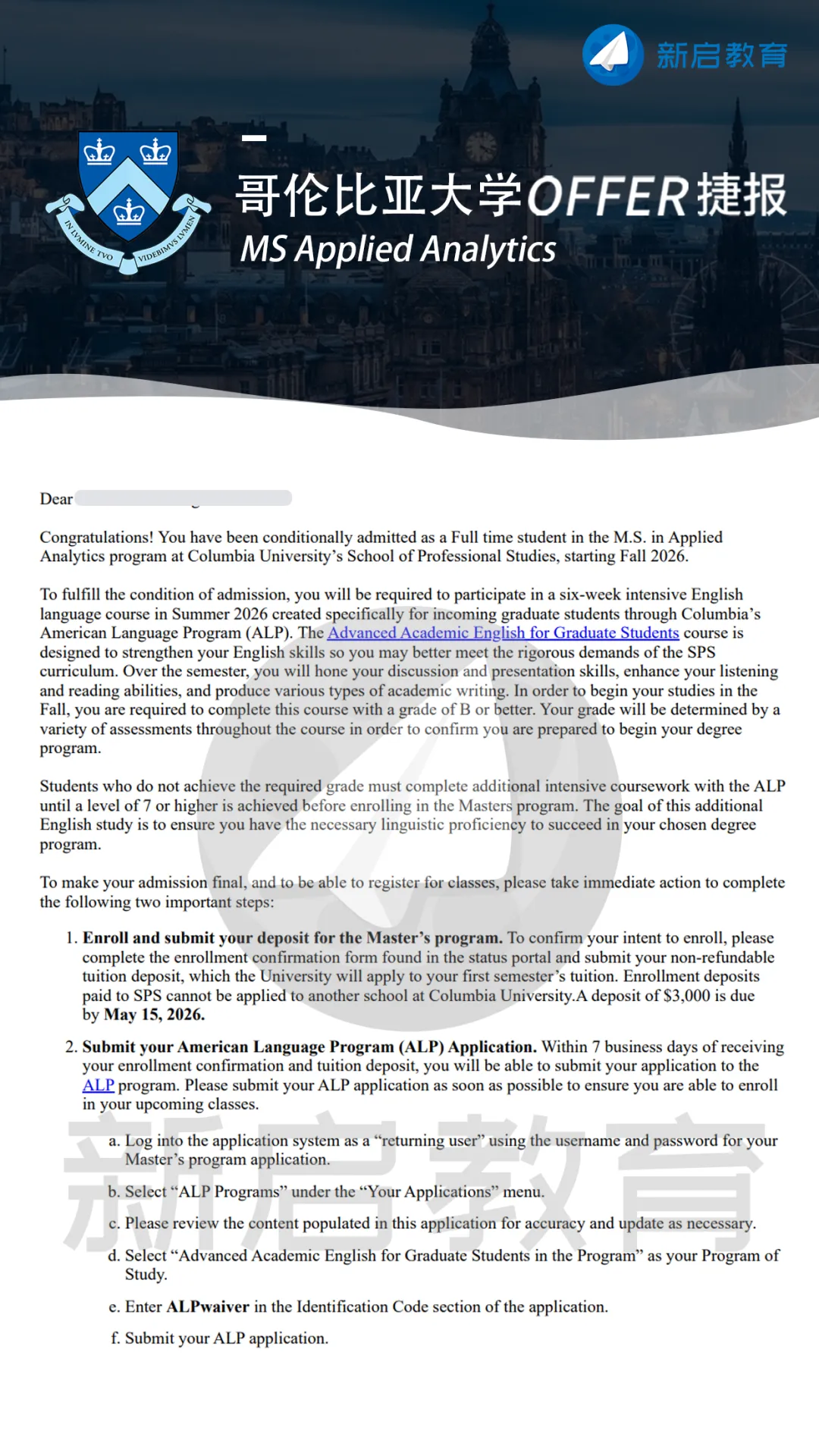 恭喜新启H学员斩获哥伦比亚大学offer?: