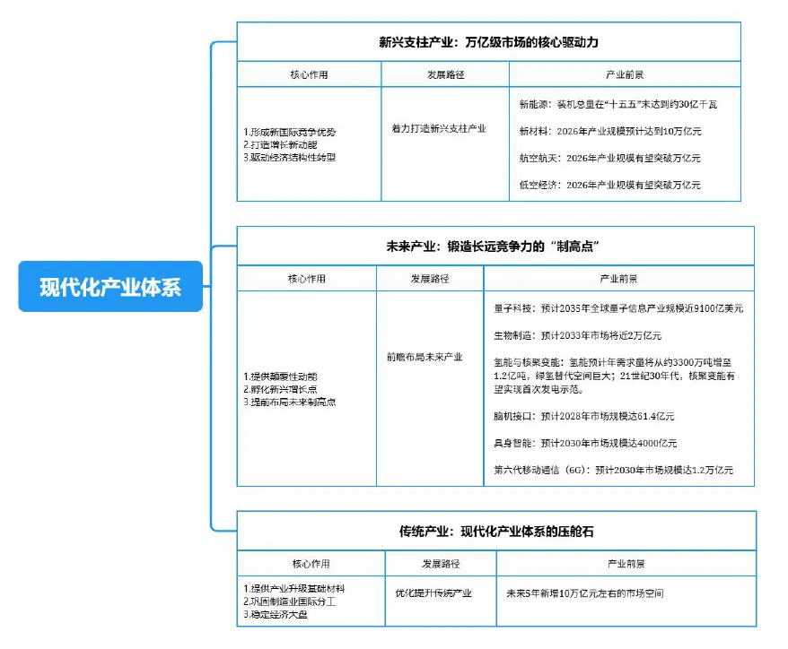 根据最新战略部署,“建设现代化产业体系”被置于首要位置 。这一体系由三大支柱构成: