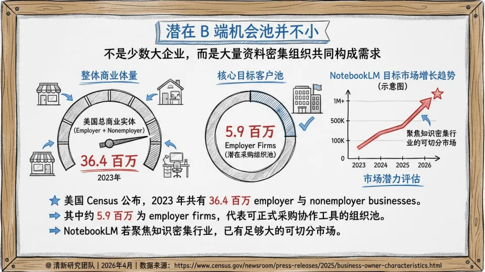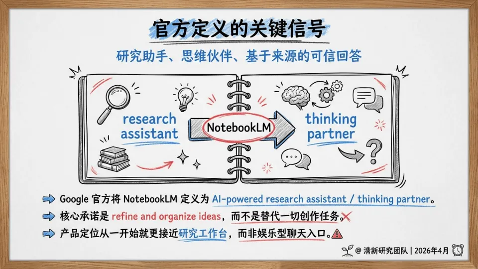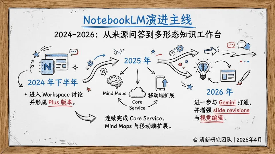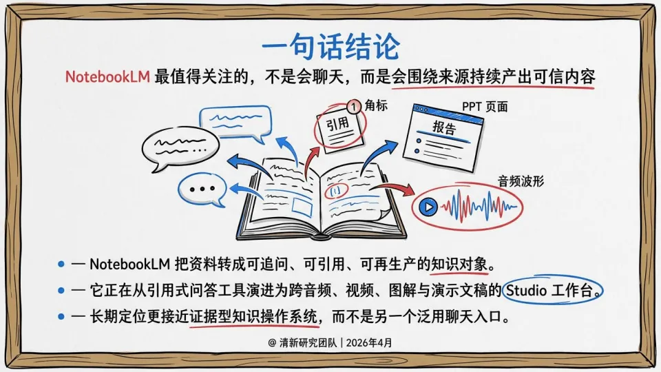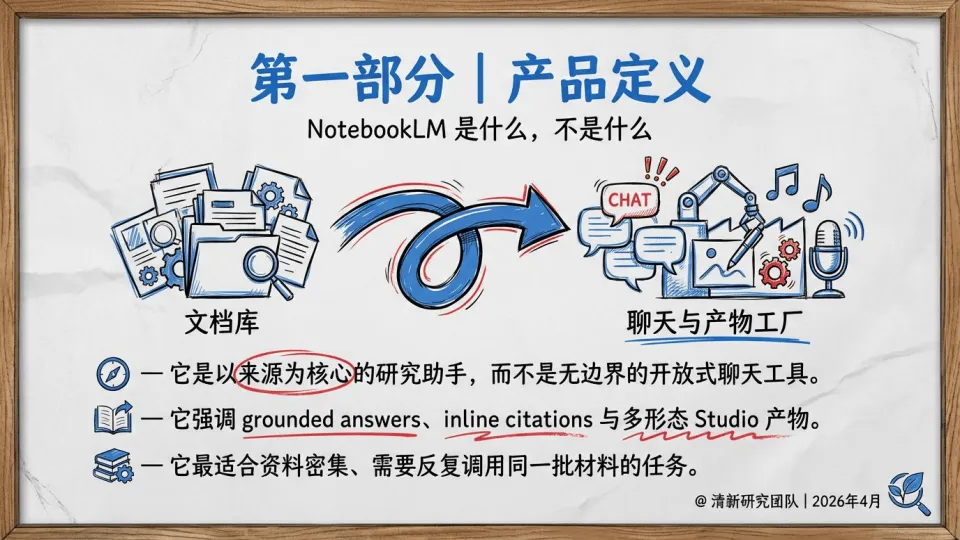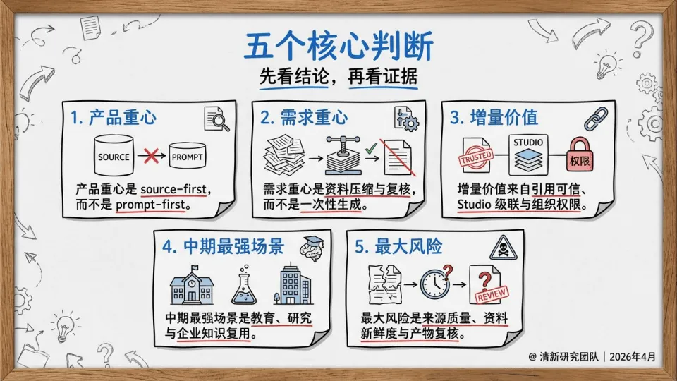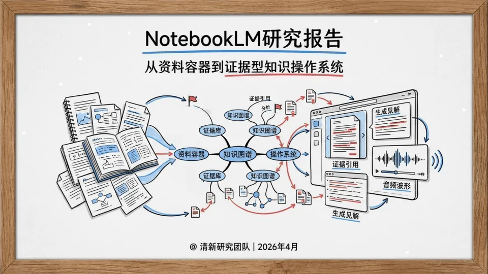 NotebookLM是Google推出的以来源为核心的AI研究助手,核心是围绕资料产出可信可引用内容,正从引用式问答工具演进为跨多形态的Studio工作台,长期定位为证据型知识操作系统。其采用source-first架构,先建立边界化资料池再开展对话与输出,支持文本、音频、网页等多类来源导入,具备引用回溯、笔记沉淀、音频概览、思维导图、测验、视觉摘要、演示文稿生成等能力,已接入Workspace并与Gemini打通。该产品契合资料过载下知识工作压缩、复核、转译、共享的刚需,核心场景聚焦教育、研究与企业知识复用,通过资料资产化、证据压缩比、Studio级联、来源护城河四大核心逻辑构建差异化优势,以组织权限与隐私保障、多形态复用等形成付费基础,是面向知识密集场景的可信知识效率工具。