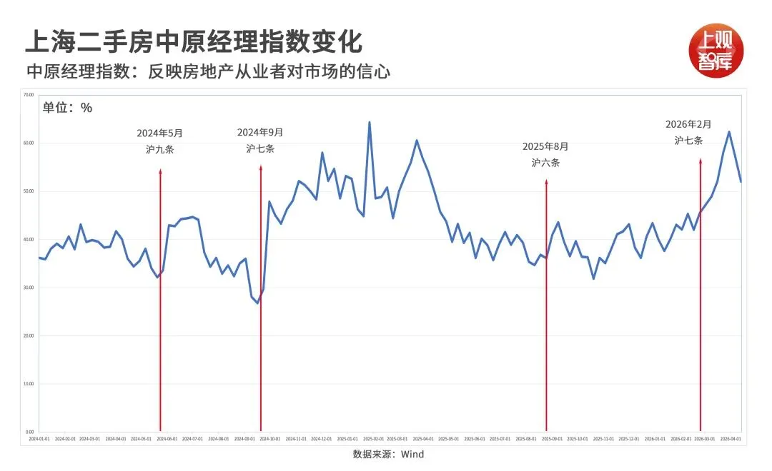 中原经理指数反映了地产经理人对城市房地产市场走势的看法。一般来说,大于50%即可认为市场处于向好区间。数据显示,上海二手房经理指数在3月末达到62.32%的高点。